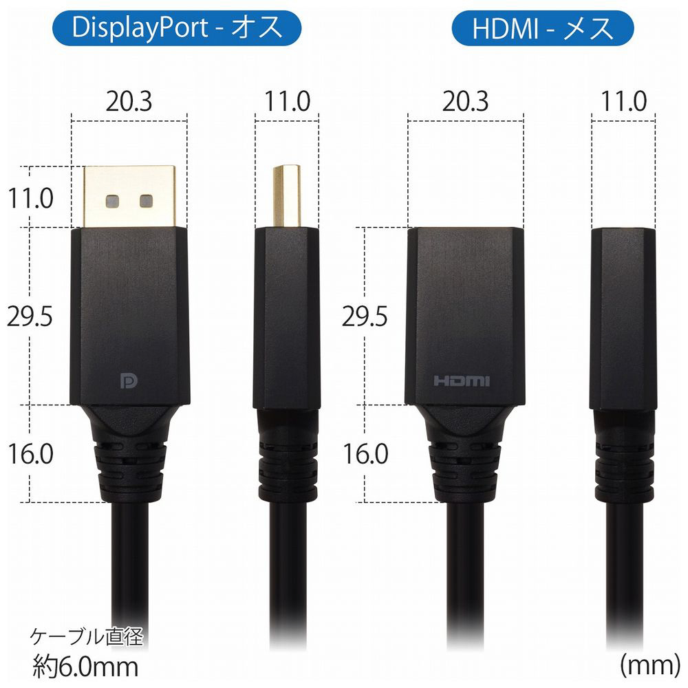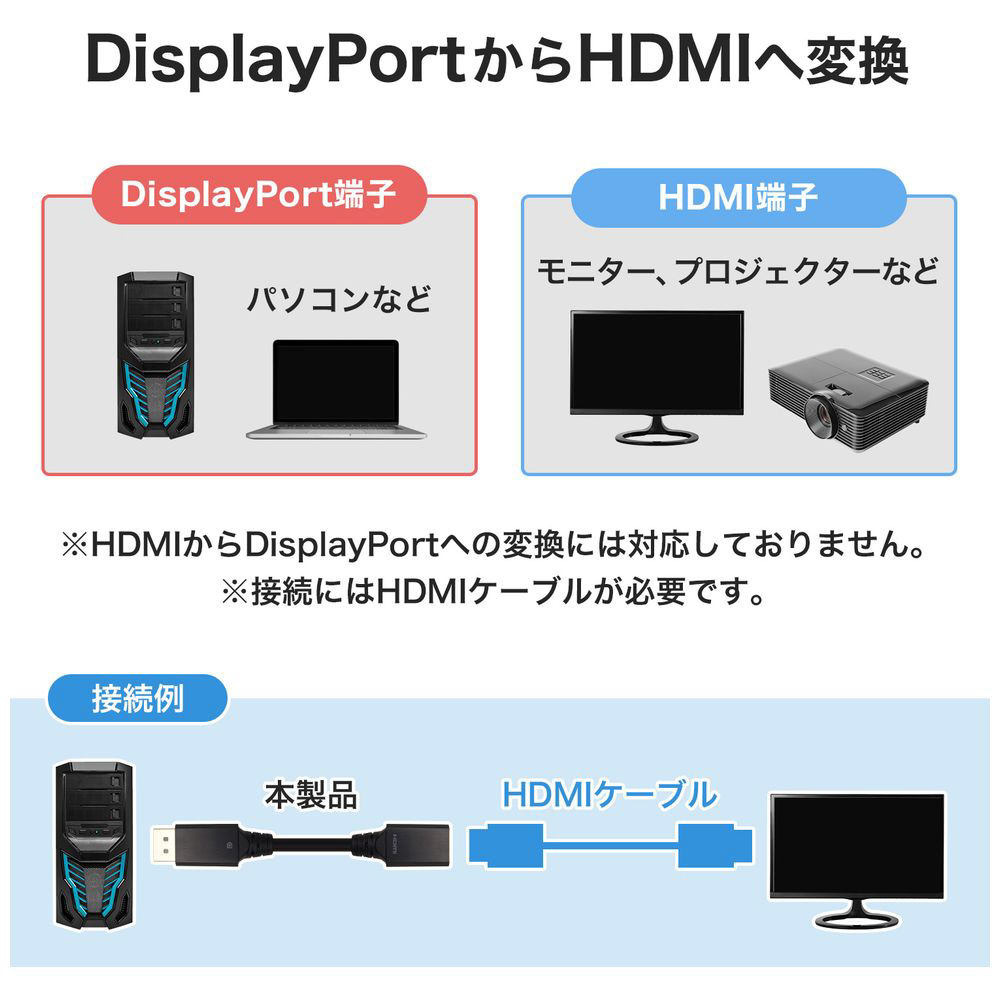 ※単方向信号設計のため、HDMIからDisplayportへの変換には対応しておりません。