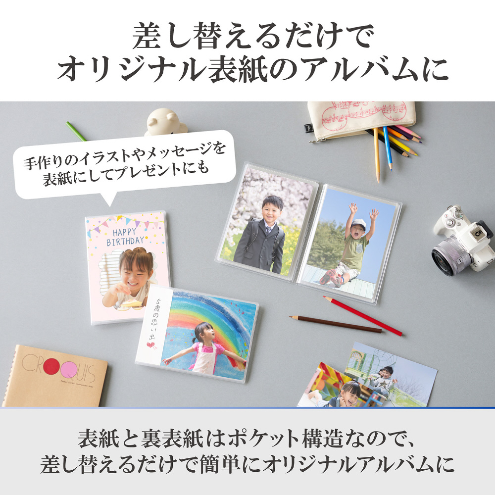 ポケット構造になっているので、表紙の写真をお気に入りの1 枚に入れ替えるだけで簡単にオリジナルのアルバムがつくれます。思い出を共有したい人へのプレゼントにも最適です。