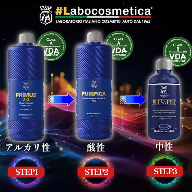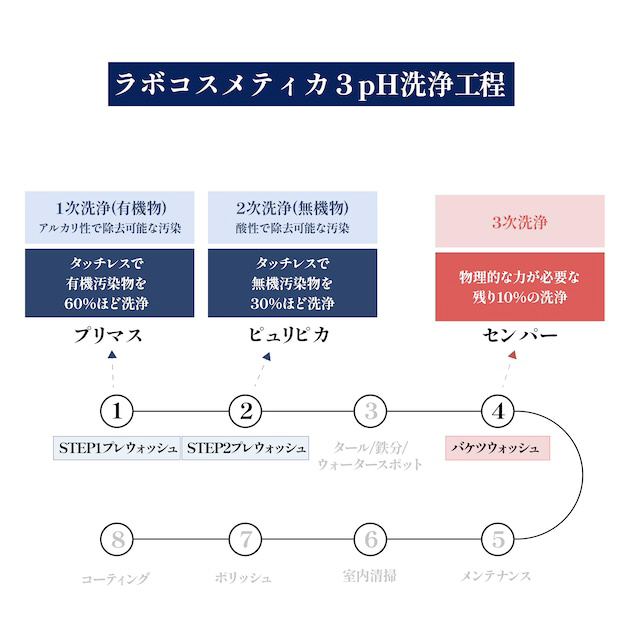 「3pH」とは異なるpH値「アルカリ性」→「酸性」→「中性」のシャンプーを順に使用する事で汚れを効果的に除去する事ができる洗車方法です。