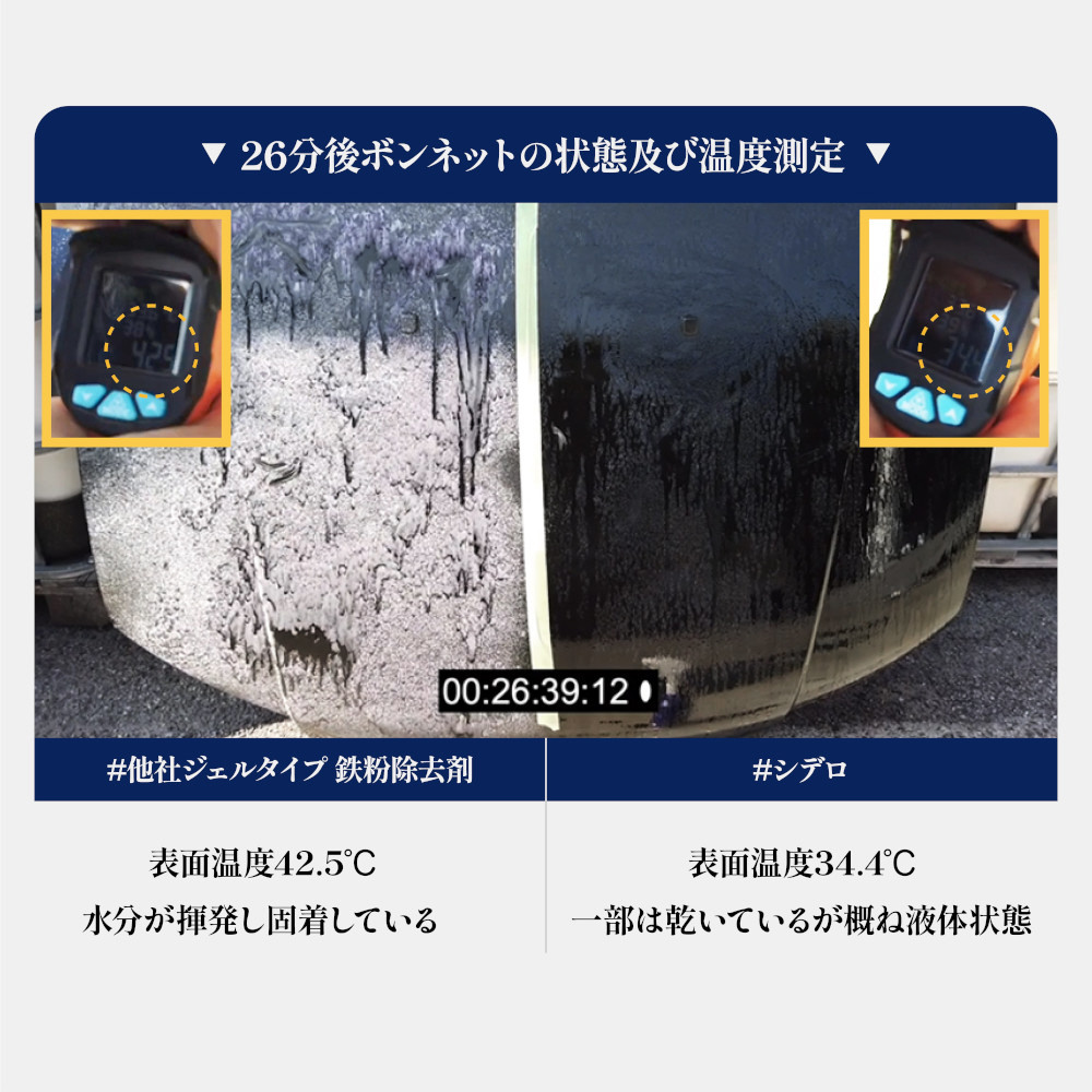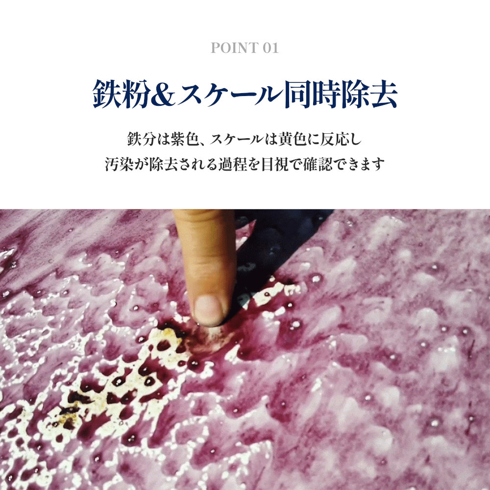 鉄粉は紫色、スケールは黄色に反応し、汚染が除去される過程を目で確認できます。