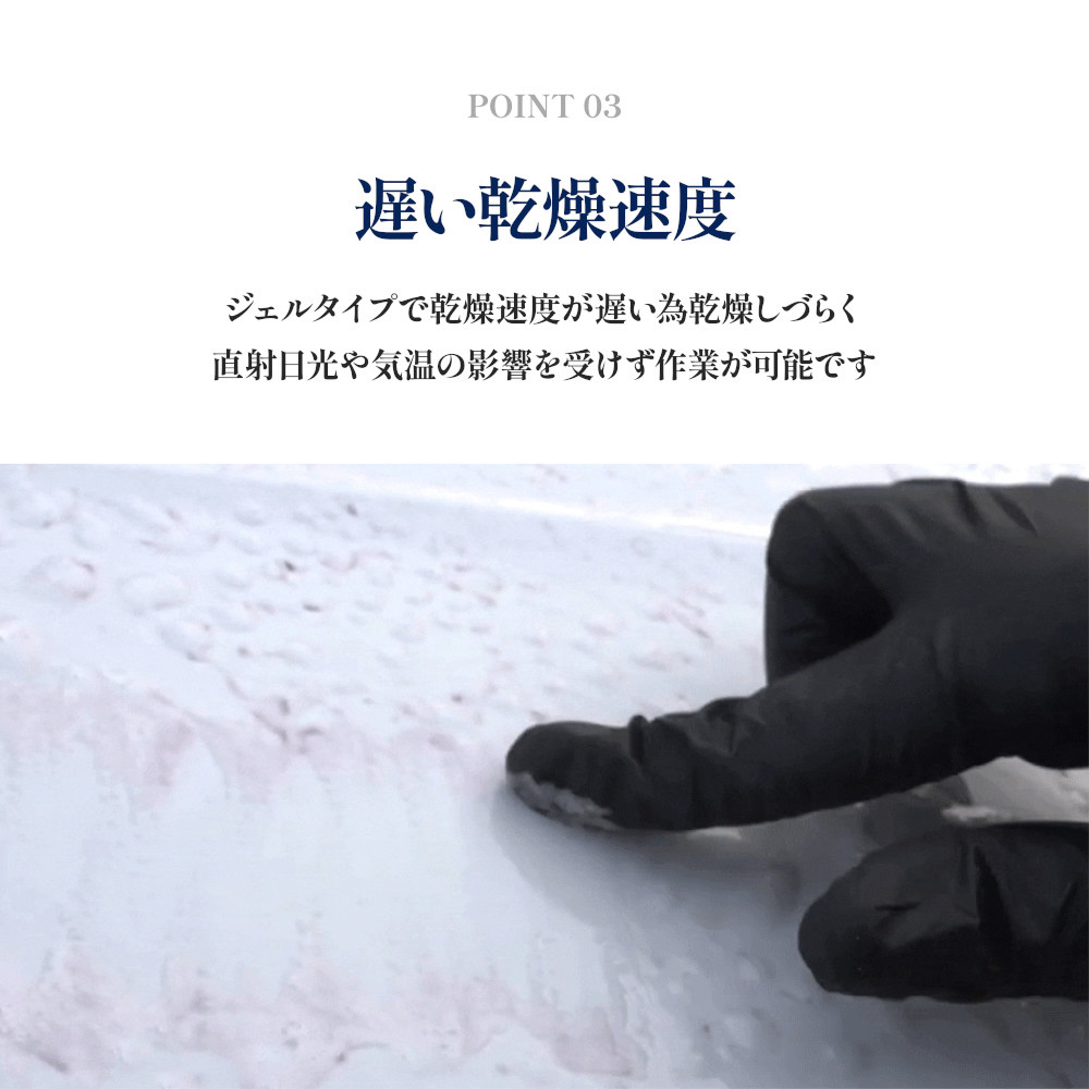 FRG(Fluid Reverse in Gel)技術により垂直面でも優れた吸着力。ジェルタイプで乾燥時間が遅いので場所を選ばずに使用できます。