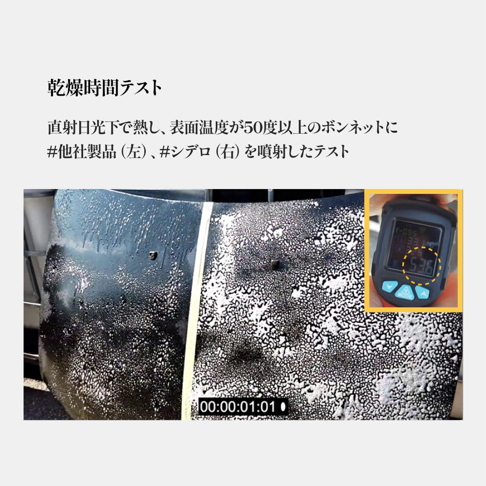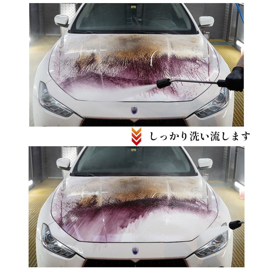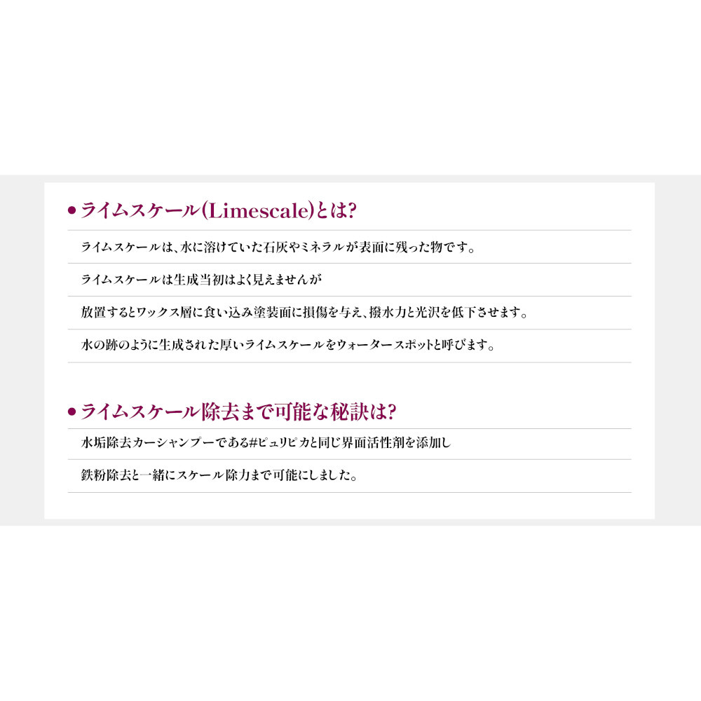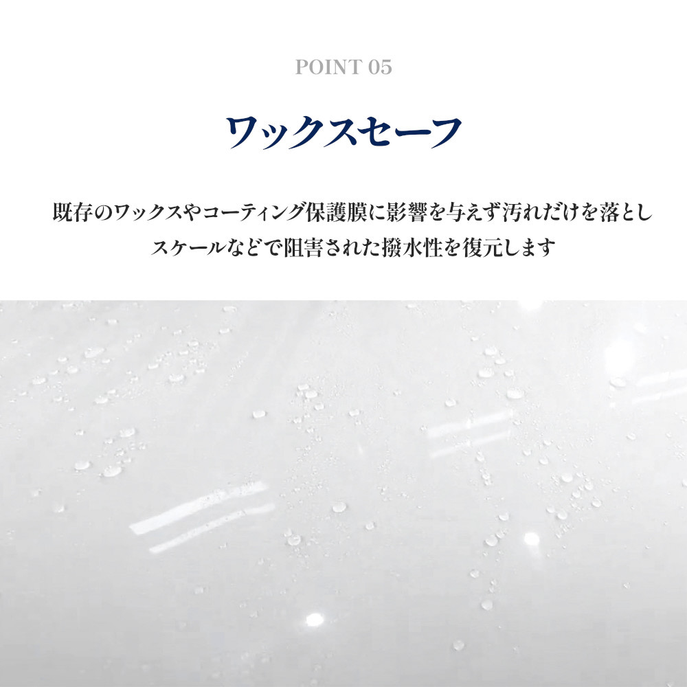 既存のワックスやコーティング保護膜に影響を与えず汚れだけを落とし、スケールなどで阻害された撥水性を復元させます。