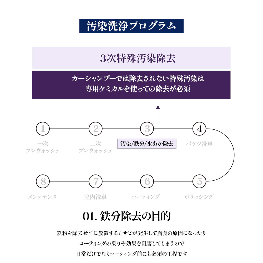 鉄粉を除去せずに放置すると、サビが発生して腐食の原因になったりコーティングの乗りや効果を阻害してしまうので、日常だけでなくコーティング前にも必須の工程です。