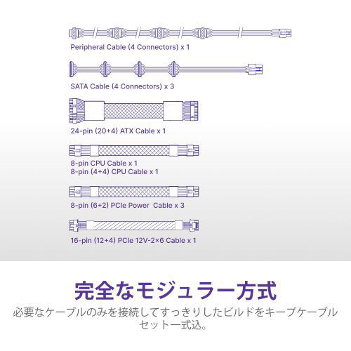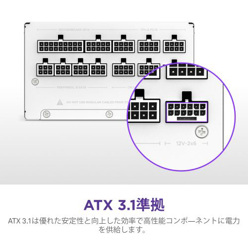 ATX3.1規格準拠 80PLUS GOLD規格のATX電源。最小限のノイズで最大限のパフォーマンスを発揮。最上位のGPUやCPUによる大量の電力消費にも対応します。各種ケーブル、コネクタも全てホワイトで統一されており、システムを「オールホワイト」にしたいユーザーにとって最高の選択肢となっています。(※)電源ケーブルのみホワイトではありません。