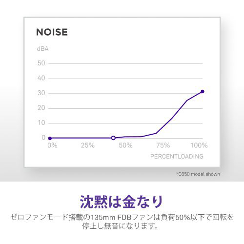 135mm FDBファンは、負荷50%以下になると静音を保ち、スイッチング周波数を微調整することでコイル鳴きを低減します。