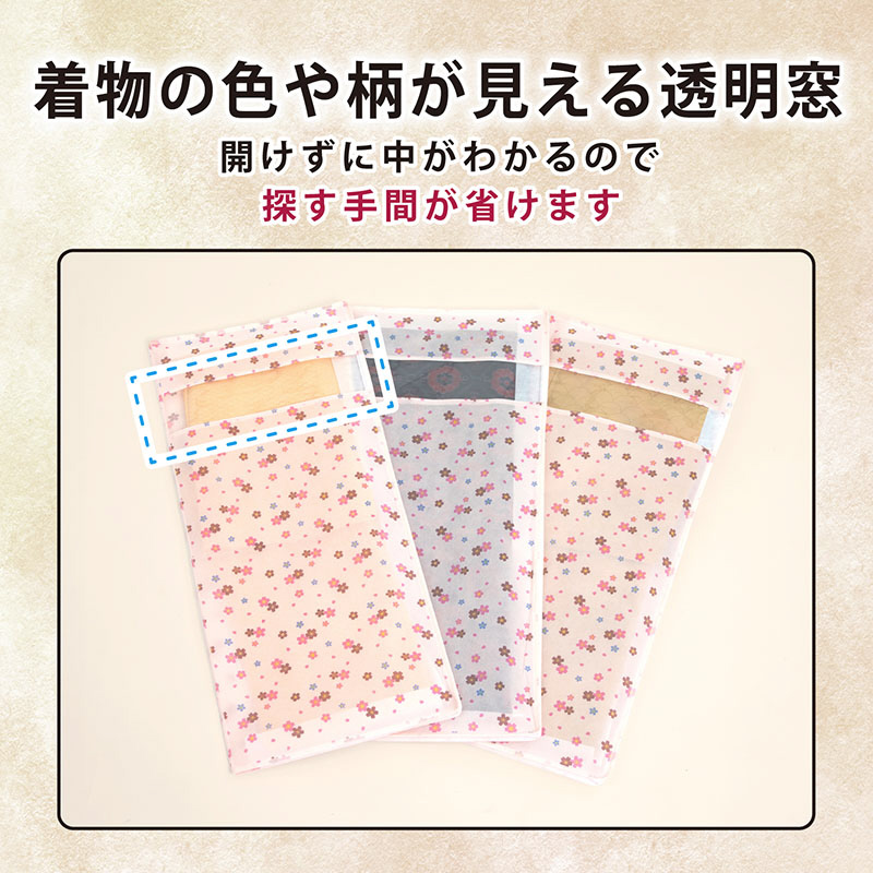 透明窓付きで収納したまま中身の確認ができる。淡いグリーンの生地にオリジナルのモダンな和柄をプリント。使わないときは折りたためてコンパクトになるので場所を取らずに保管可能。浴衣や振袖などの収納にも使える。