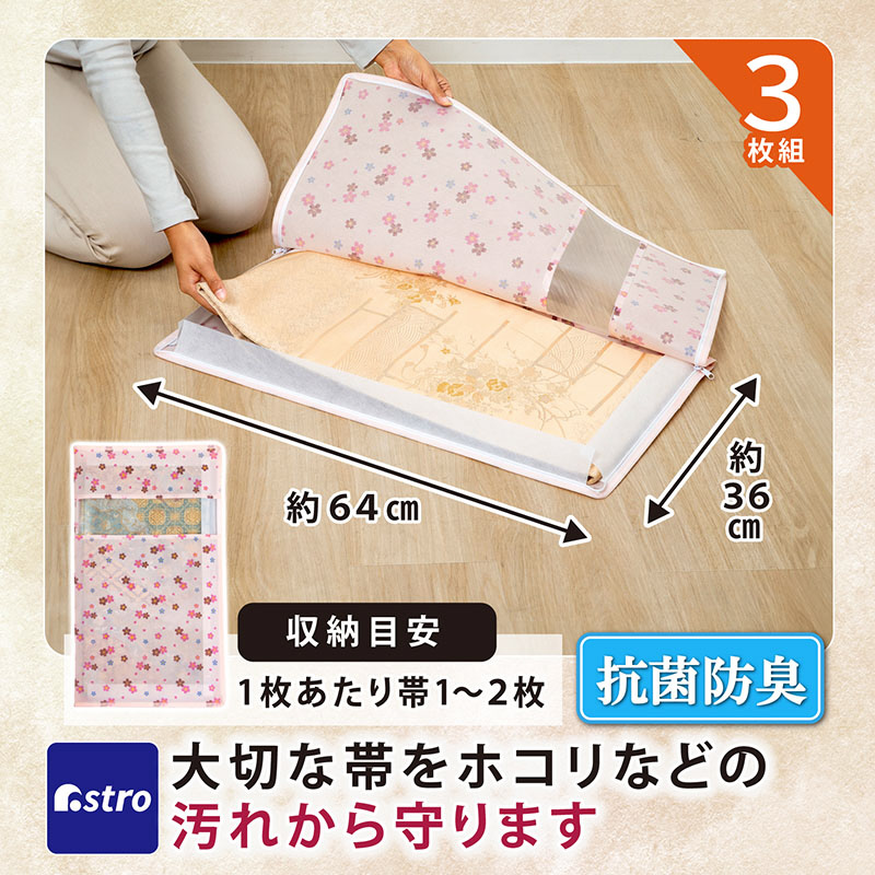 サイズ/約64×36cm、カラー/ピンク系、柄/さくら柄、内容/3枚、収納目安(袋1枚あたり)/帯:約1〜2本(厚みにより異なる)、材質/ポリプロピレン・ポリエチレン