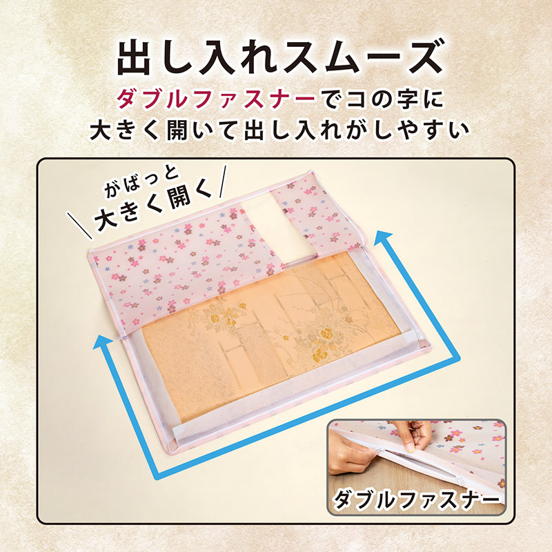 ダブルジップファスナーで3辺が開くので着物の出し入れがスムーズ。ファスナーによる挟み込みを防ぐ布付き。