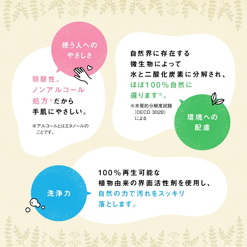 ○再生可能な植物由来の界面活性剤を使用しています。高い生分解性が特長です。