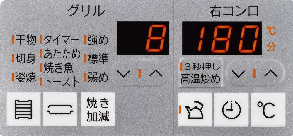 強火力バーナー(左右コンロ)に温度設定機能・高温炒め・タイマー機能・湯わかし機能、小バーナー(後コンロ)に炊飯機能(ごはん・おかゆ)・タイマー機能を搭載しています。