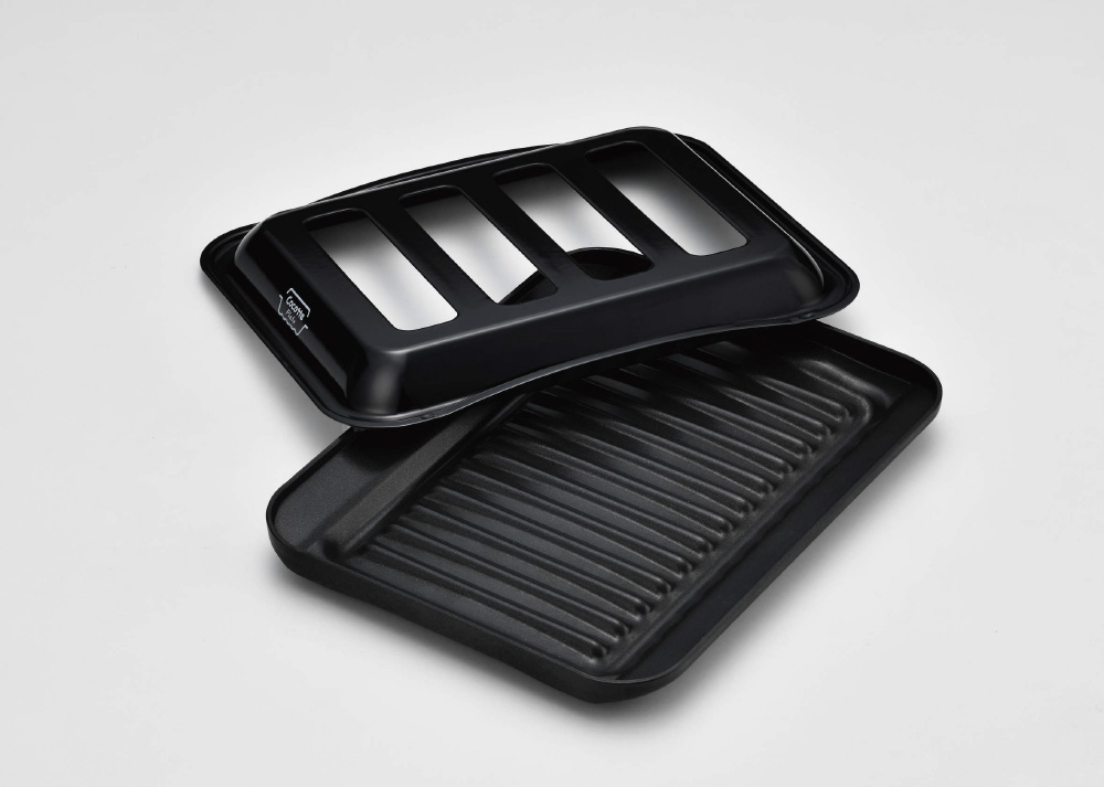 グリル皿はクリアコート、焼網はフッ素コートを施しています。焼網にツメがないためシンクにキズが付きにくく、使い勝手とお手入れ性に優れています。