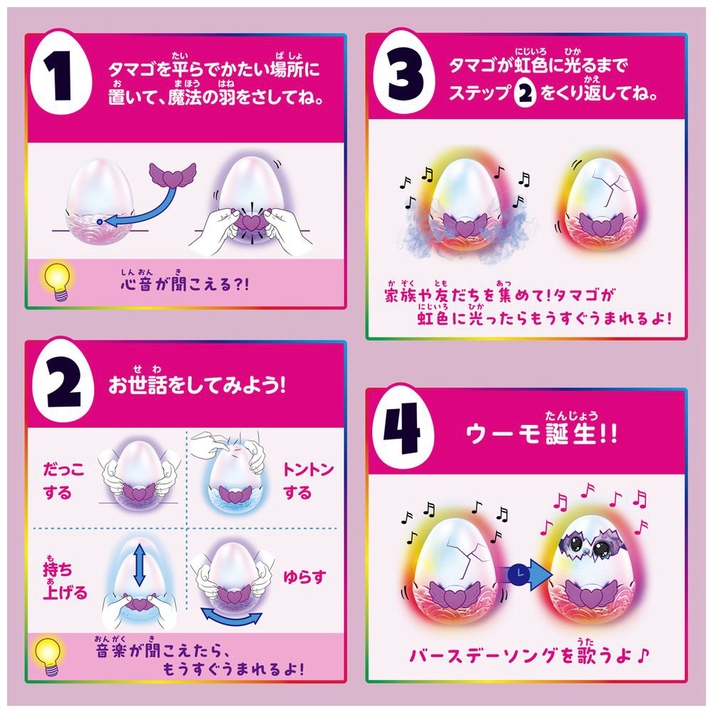 たまごが虹色に光ったら、ウーモが中から殻をつつき始めて生まれてくるよ。