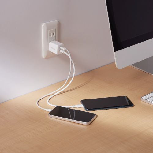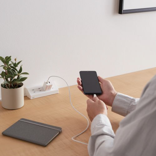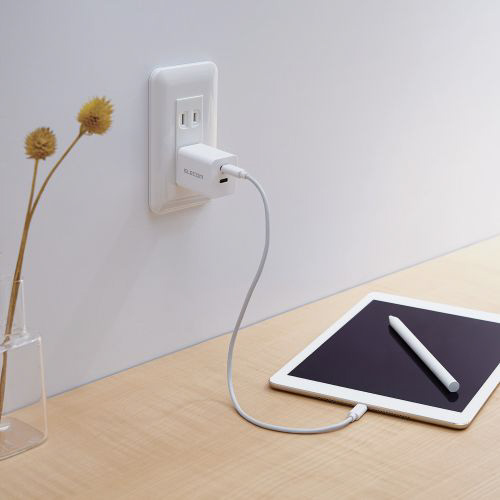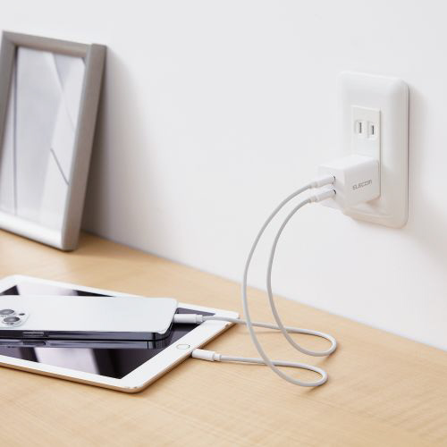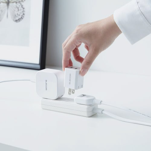 USB Type-C(TM)(USB-C(TM))ポートを2ポートを搭載し対応するスマートフォン、タブレットなどを超高速充電できるUSB AC充電器です。手のひらにすっぽり隠れるほど小さく、軽量なので外出や出張などの際の持ち運びに便利です。
