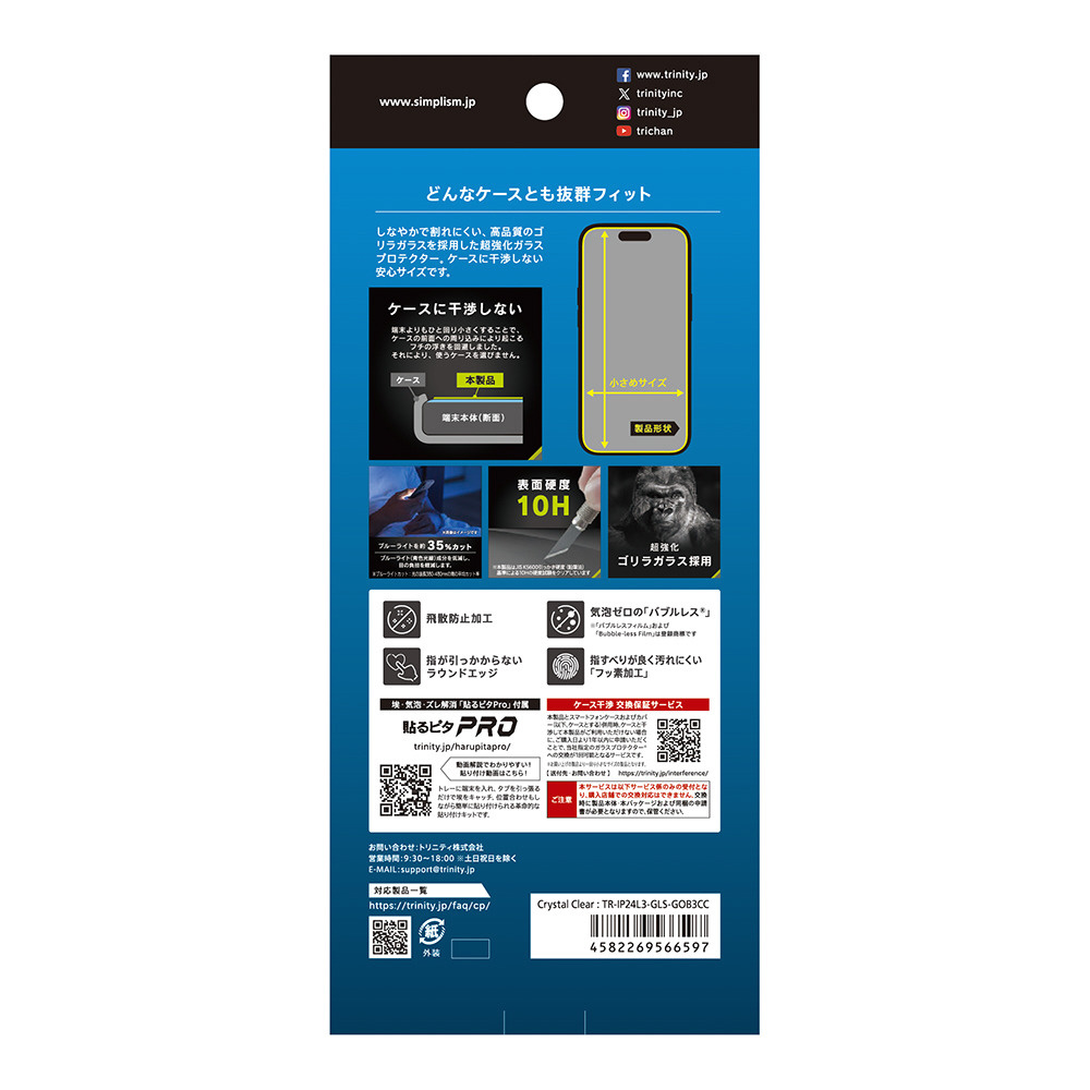 iPhone 16 Pro Max(6.9インチ) ケースとの相性抜群 ゴリラガラス 黄色くないブルーライト低減 画面保護強化ガラス 光沢 TR-IP24L3-GLS-GOB3CC
