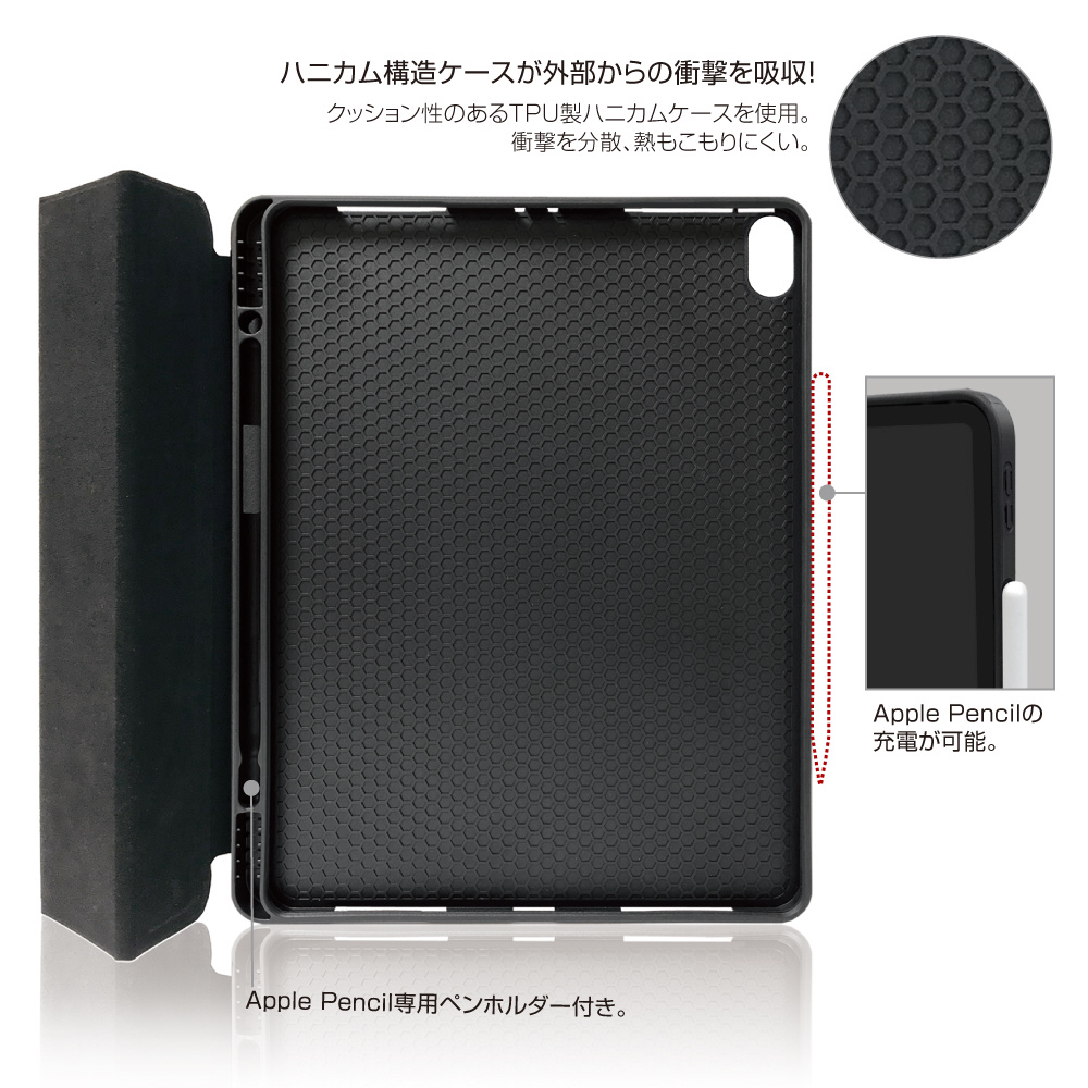 TPU製ハニカムケースとPU製液晶カバーとの組み合わせで、iPadをスマートにガード。