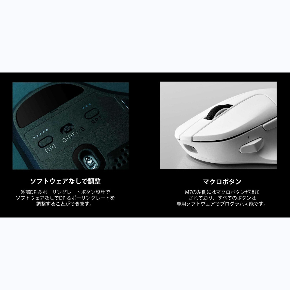 M7には、最小クラスのType-C 2.4GHzレシーバーとType-A 2.4GHzレシーバーを設計しました。どちらを選んだとしても接続すれば、すぐにご利用いただけます。Report Rateボタンを押すと、2.4GHz/有線モードでポーリングレートを125Hz〜1000Hzの3段階に切り替えることができます。