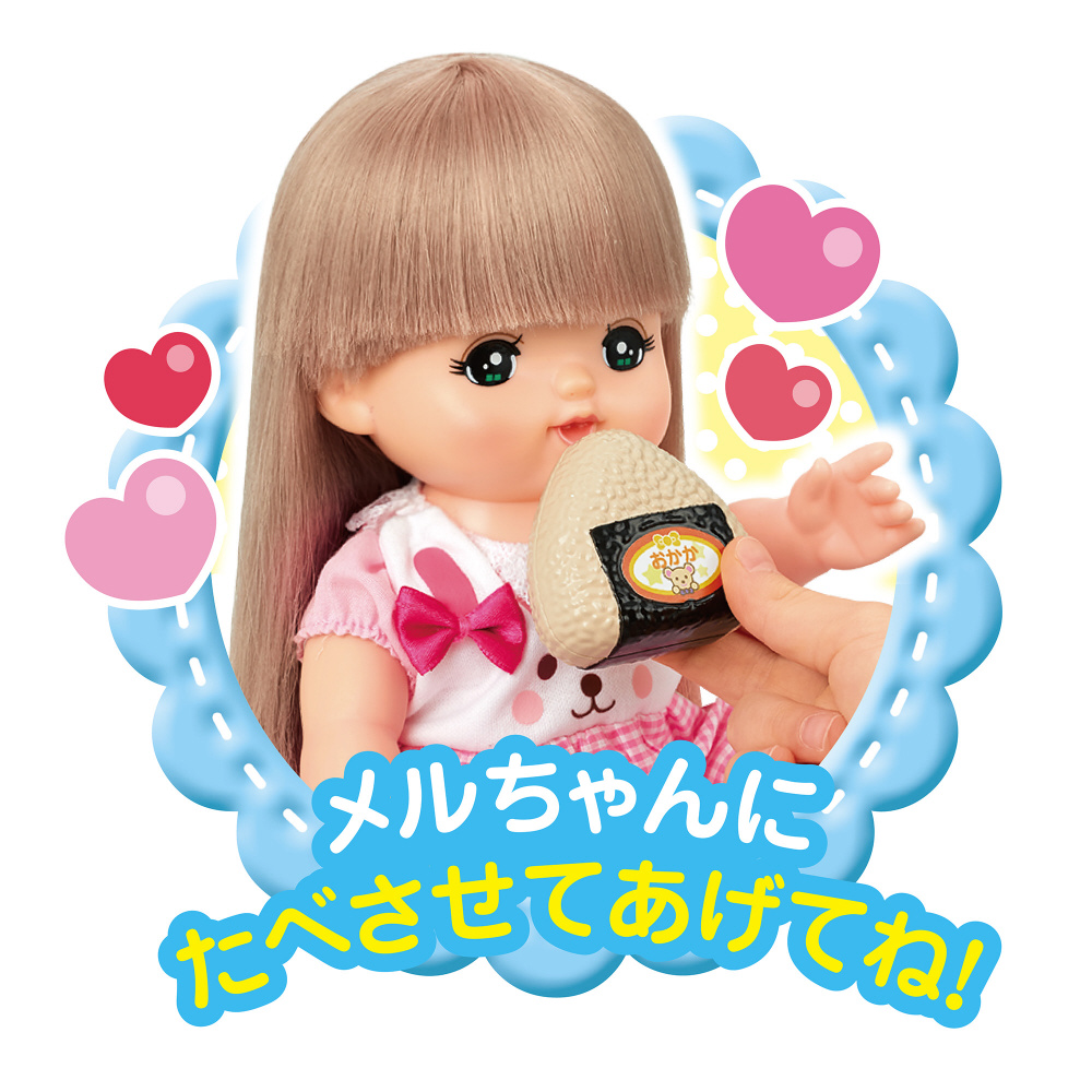 メルちゃんに食べさせてあげたり、ごっこ遊びが楽しめます。
