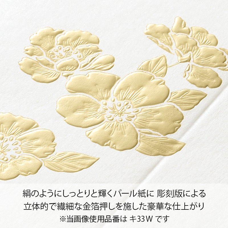 絹のようにしっとりと輝くパール紙に彫刻版による立体的で繊細な金箔押しを施した豪華な仕上がりです。
