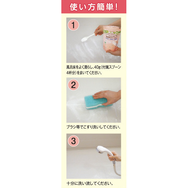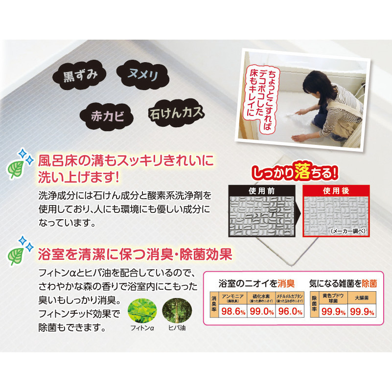 ガンコな風呂床の黒ずみをスッキリ洗浄!計量スプーン付き。洗浄成分には石けん成分と酸素系洗浄剤を使用しており、人にも環境にも優しい成分になっています。風呂床の溝もスッキリきれいに洗い上げます!