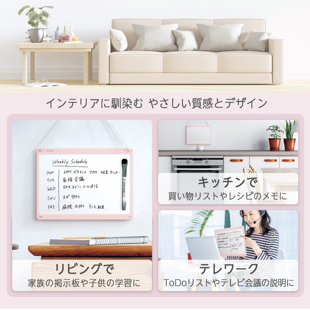 インテリアに馴染む! 従来にはない柔らかな質感とデザイン、根強い人気のくすみカラーのホワイトボード。フレーム材として柔らかなエラストマー素材を採用したグリーン・ピンク・グレーの3色展開。