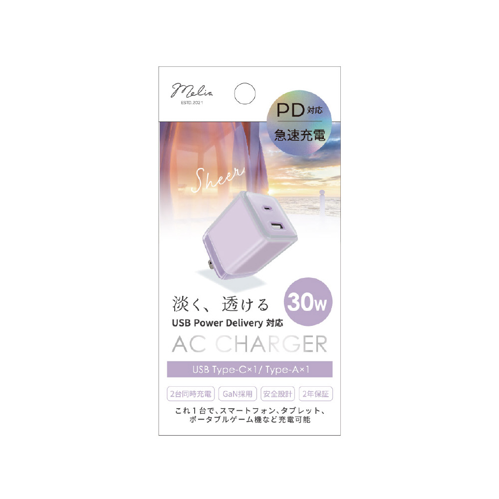 Sheerカラー PD充電器 Type-C/1USB 30W パープル [2ポート /USB Power Delivery対応]