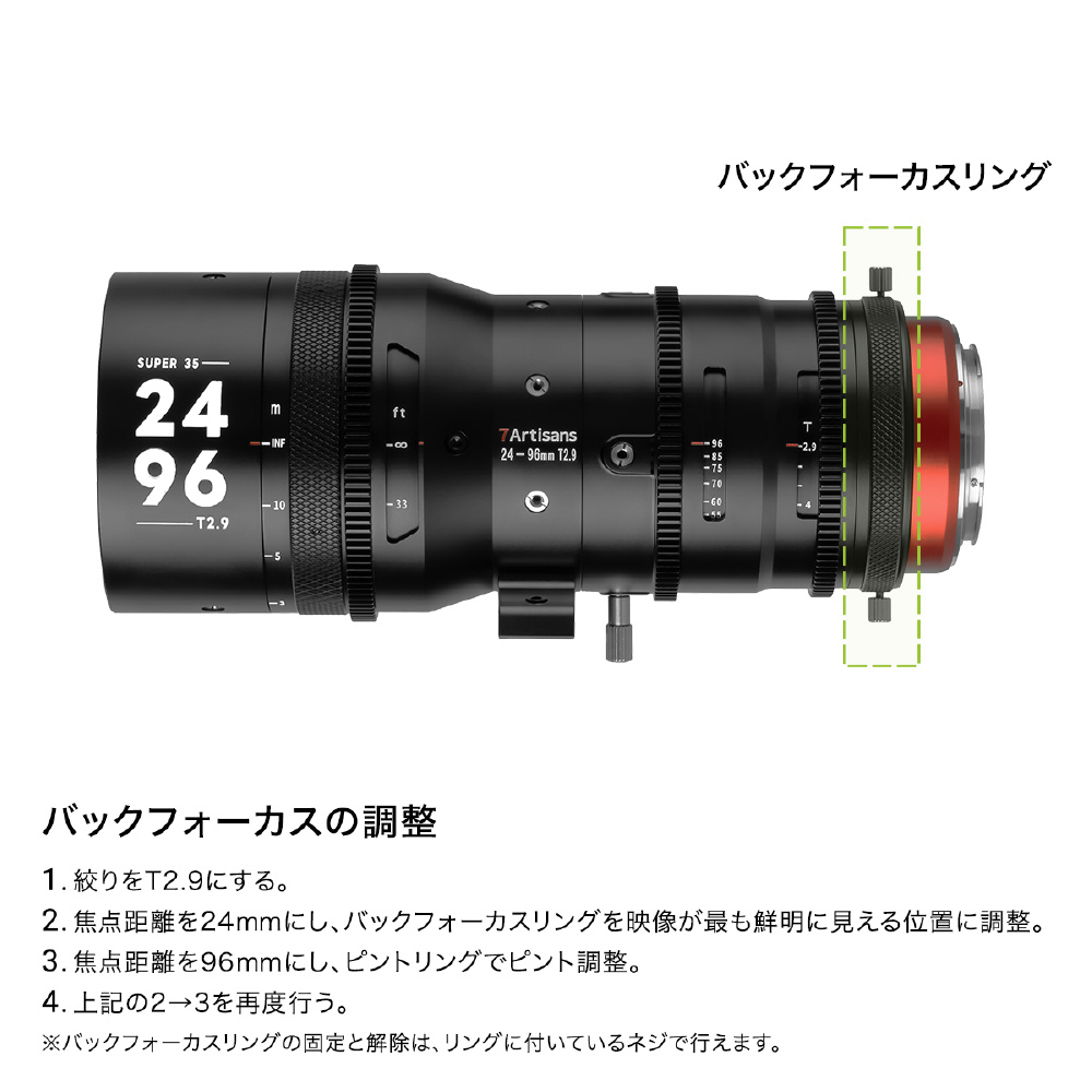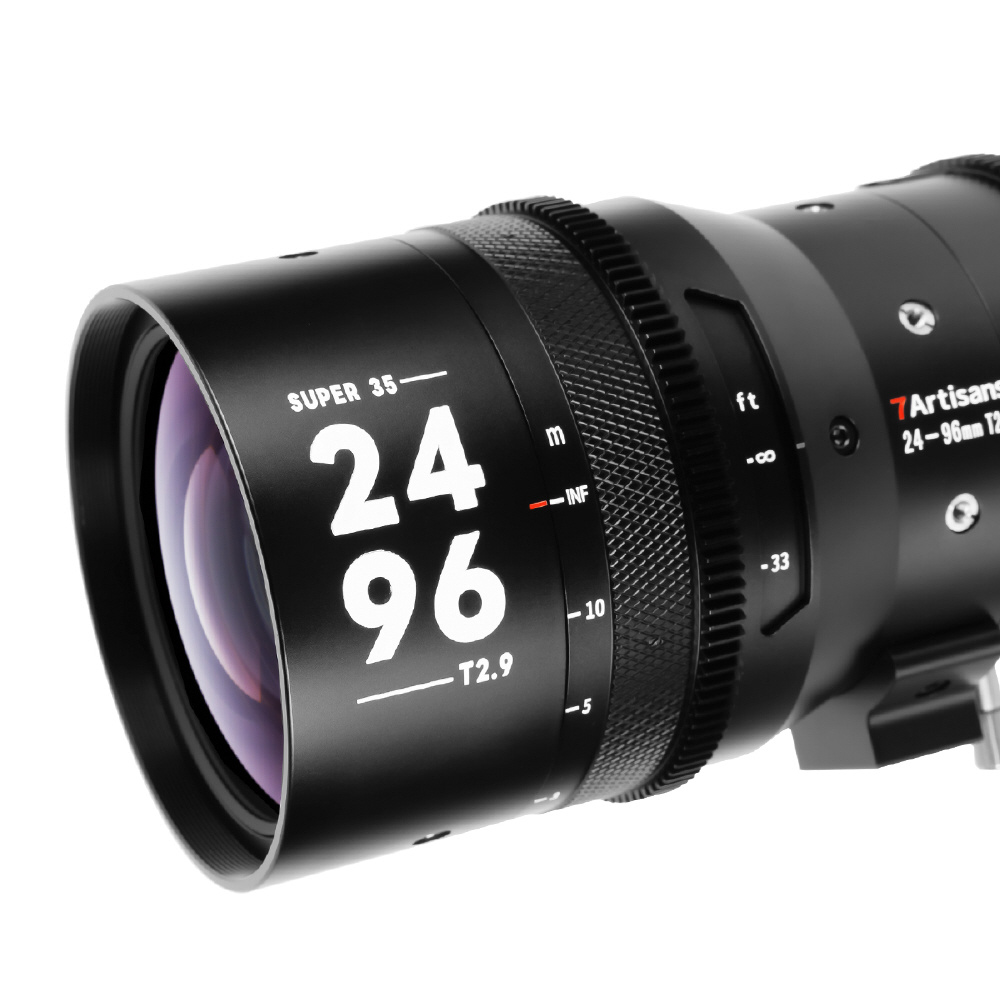 七工匠(しちこうしょう)7Artisans Sprite 24-96mm T2.9 S35は、ズーム比4倍の焦点距離と高い描写性能を備えたSuper35mmフォーマット対応のシネマレンズです。全てのズーム域で開放T値2.9を維持し、ズームをしてもピント位置が変わらないパーフォーカル設計を採用しながら優れたコストパフォーマンスを実現しています。