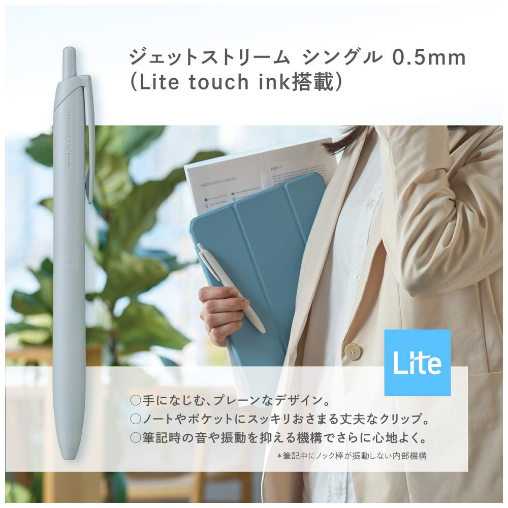 よりかろやかな書き心地を実現する、新開発『JETSTREAM Lite touch ink』を搭載したどんな人にも「ちょうどいい」を目指した単色ボールペン。