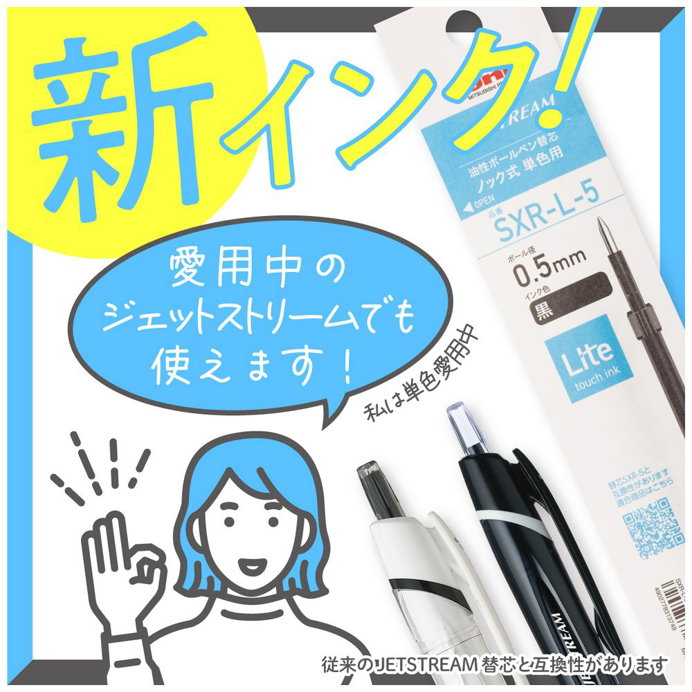 「クセになる、なめらかな書き味。」を実現する、世界初の画期的なインクシリーズから、よりかろやかな書き味の『JETSTREAM Lite touch ink』を新開発。従来のインクよりさらに筆記抵抗を減らし、よりかろやかな書きごこちを実現しました。またインクのボテや紙すべり(*)をさらに改良し、よりストレスの無い安定した筆記を提供します。時代や環境により「書く・描く」シーンが多様化する中で生まれた、JETSTREAMの新しい選択肢です。(*紙質などの条件により、ボールがすべり筆記しにくい現象)