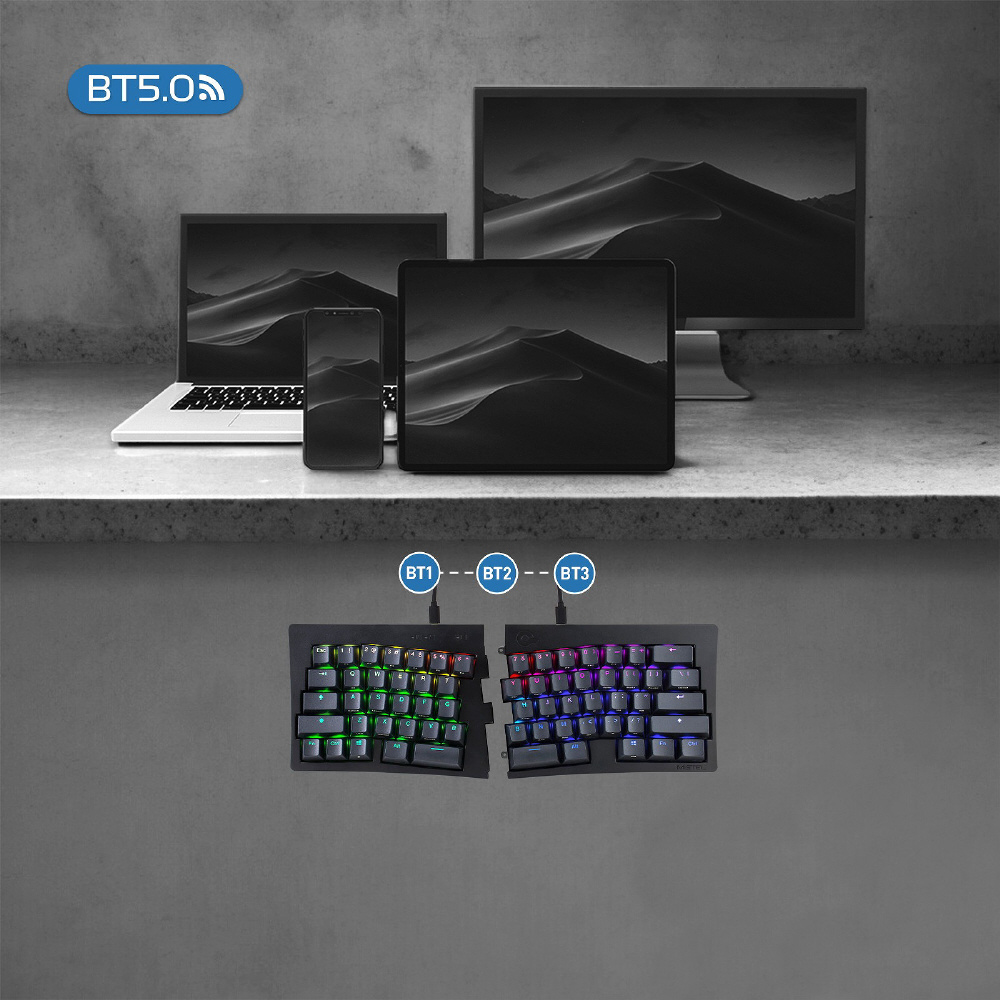 MD600 Alpha RGB BTは人間工学に基づいて設計されたアリス配列の分離型メカニカルキーボードです。キー配列にキーの向きが「八の字」状になっているアリス配列を採用しているため、腕や手首を不自然に曲げる必要がありません。それに加えて左右にも分離ができるため、肩を縮こませることなく使用でき、肩・腕・手首の負担の軽減を期待できます。
