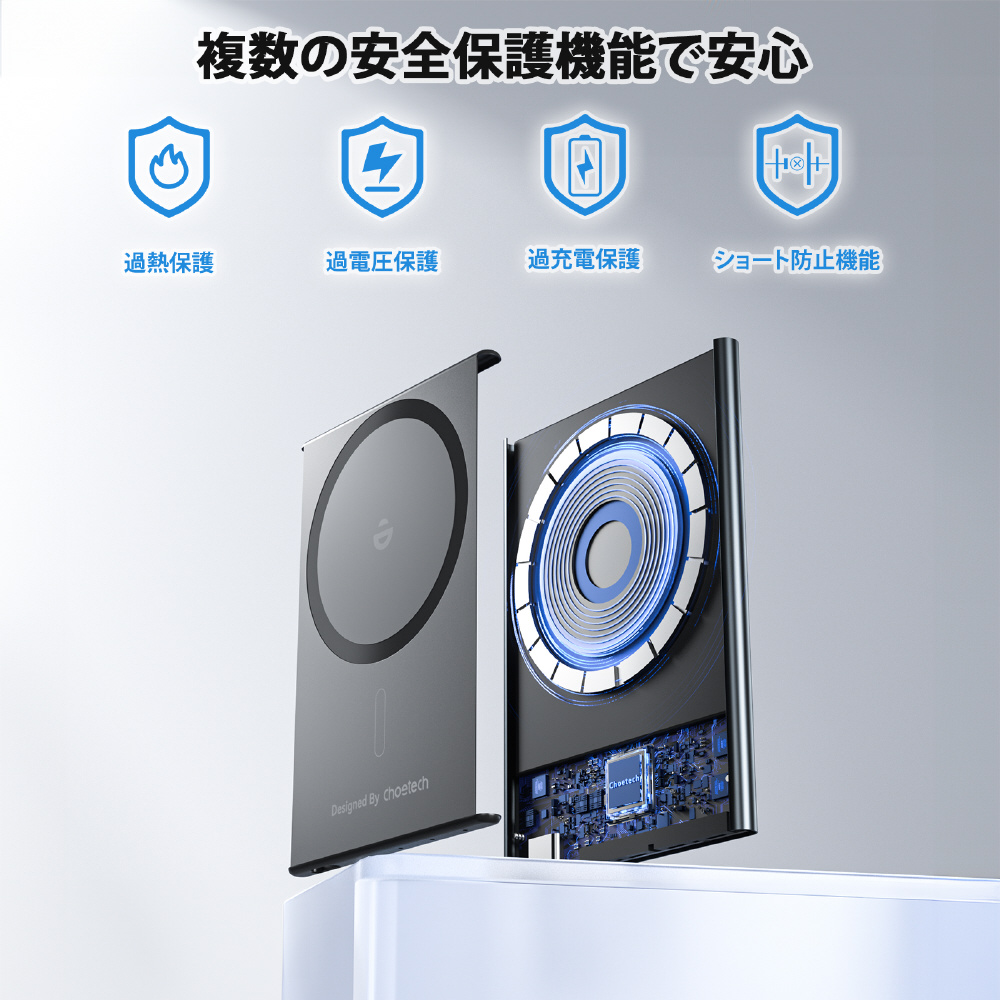過熱、過電圧、過充電、ショート防止機能を備えており、充電中の安定性を確保します。