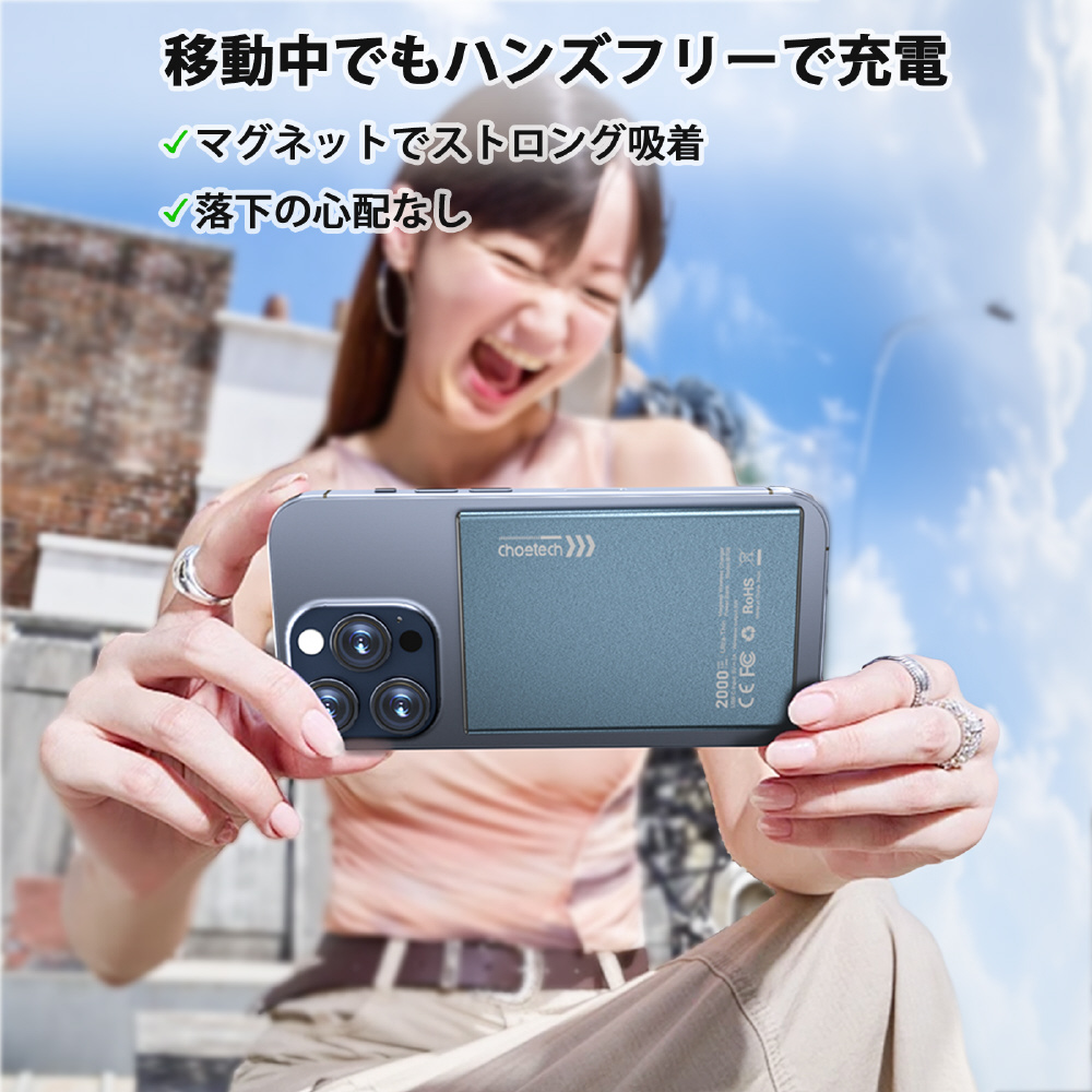 マグネット吸着でお手軽に素早く充電。強力な磁力で落下の心配がなく、移動中でもハンズフリーで充電!