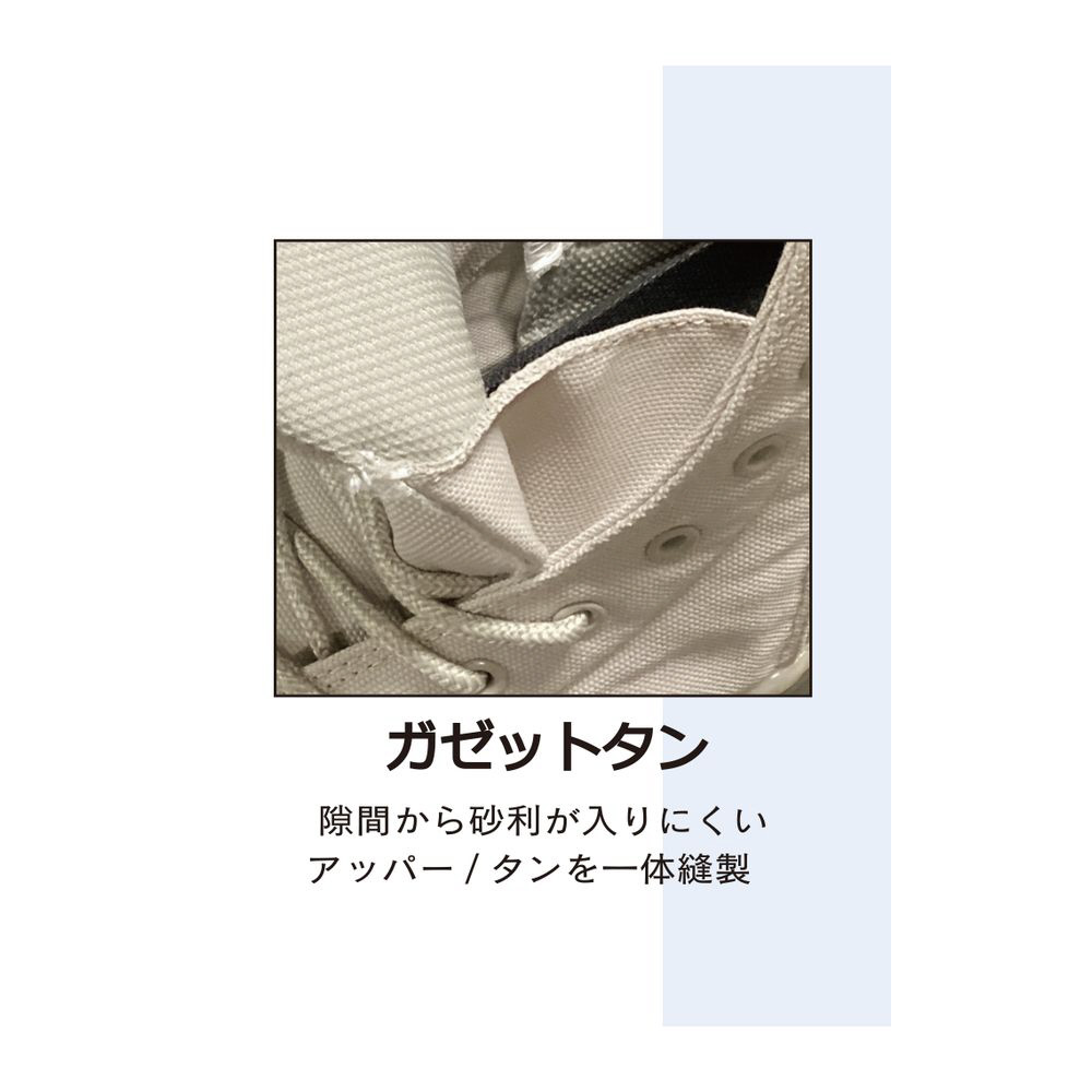 ・踵部分/シュータンには厚みのあるクッションをつけて、内部で足が遊ぶことないようフィッティングとホールド感を向上。ハードなワークシーンを想定し、砂利がタンとアッパーの隙間から入らないよう【ガゼットボタン】を採用し、さらにはアッパーとソールを縫い合わせて?離強度も高めたこだわり仕様。