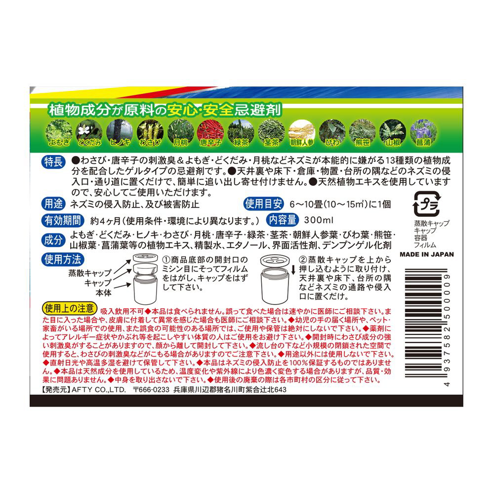 ・ワサビ・唐辛子の刺激臭&よもぎ・どくだみ・月桃などネズミ・不快害虫が本能的に嫌がる13種類の植物成分を配合したゲルタイプの忌避剤。