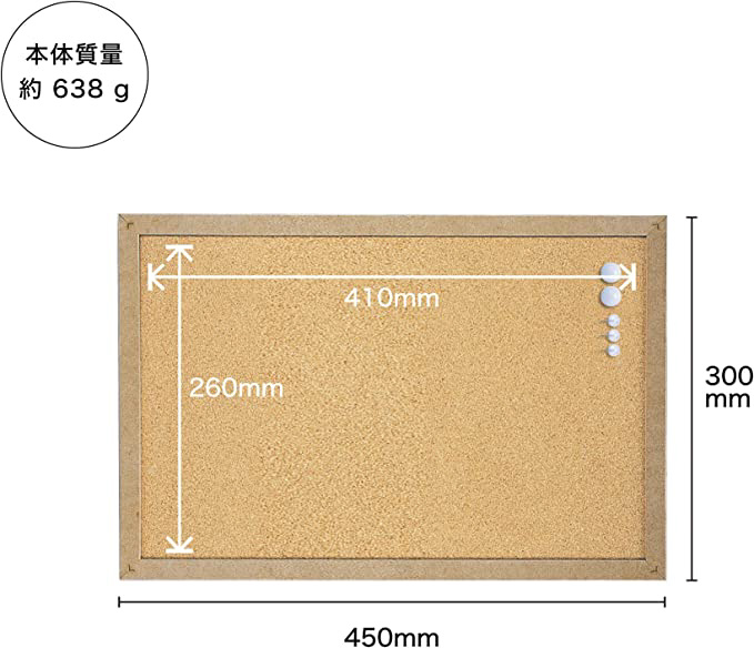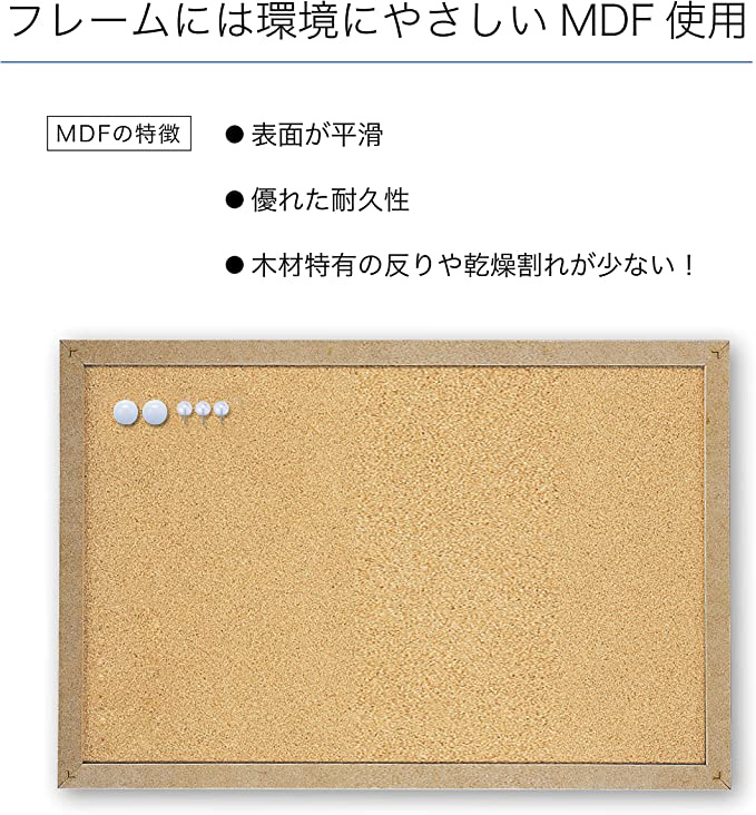 仕様2 材質:ボード面 コルク・鉄粉入りラバーシート・芯材 再生紙・フレーム MDF・フック金具 スチール・木ネジ スチール・プッシュピン PSステンレス・マグネット PSネオジウム磁石、