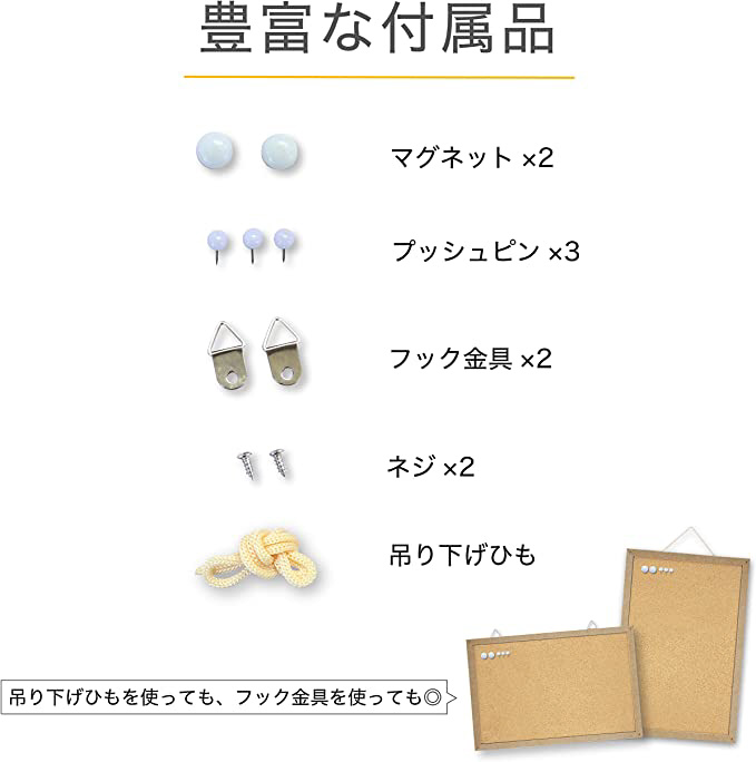 仕様3 付属品:マグネット2個、プッシュピン3個、吊り下げひも、フック金具、ねじ