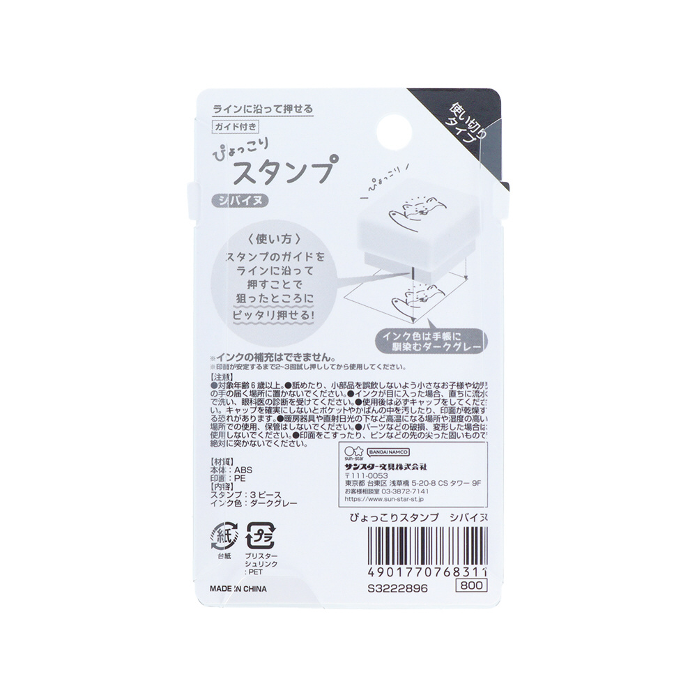 ラインに沿って押せるガイド付きスタンプ、「ぴょっこりスタンプ」。柄は、ぴょっこりスタンプ。デザインは、シバイヌ。