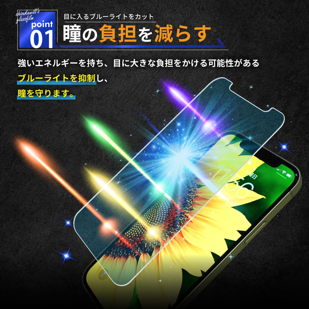 AGC旭硝子社製ガラスを採用したスタンダードガラスフィルムです。ブルーライトカット処理により長時間でも目に優しい