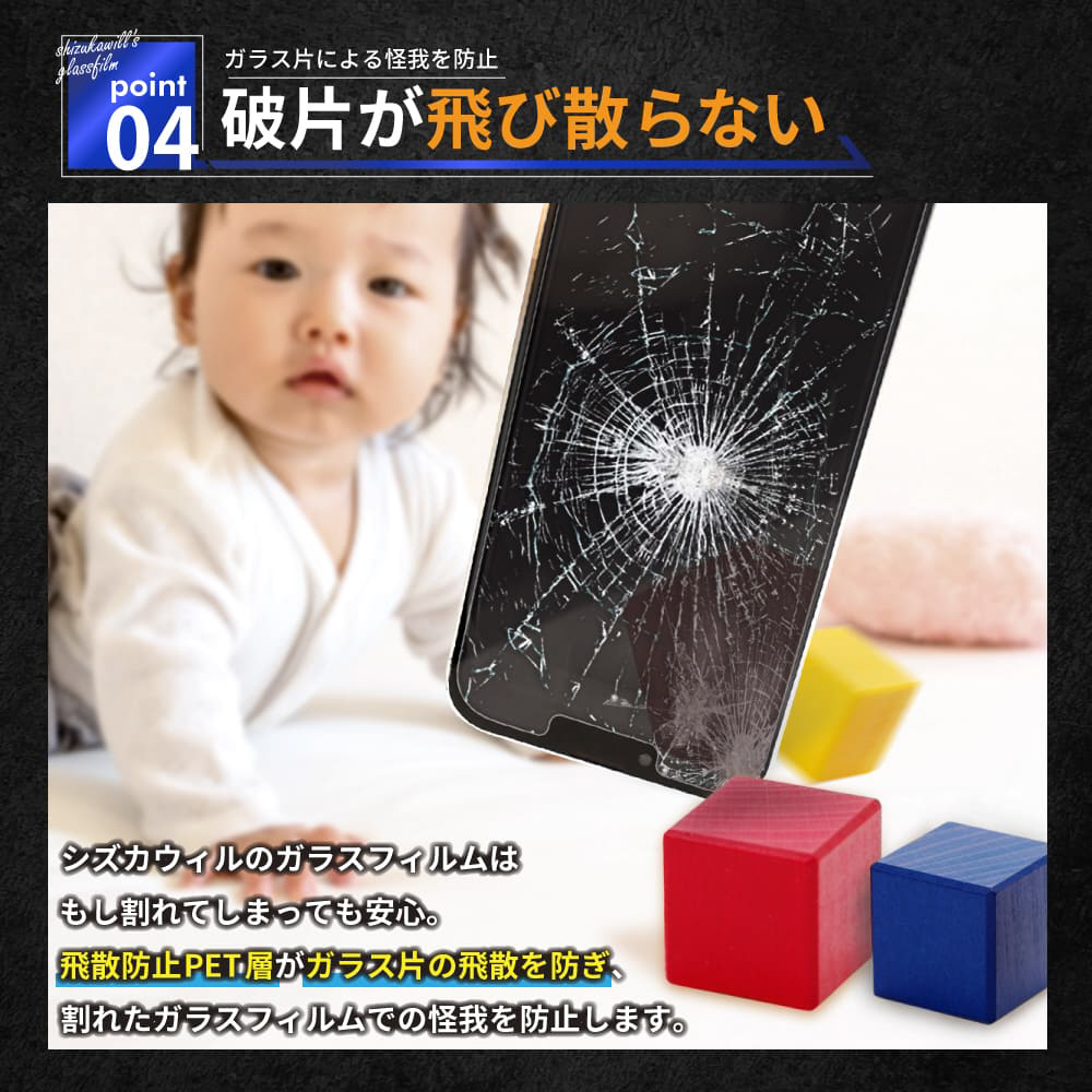 万が一ガラスフィルムが割れてしまっても破片が飛び散らずケガの心配がない
