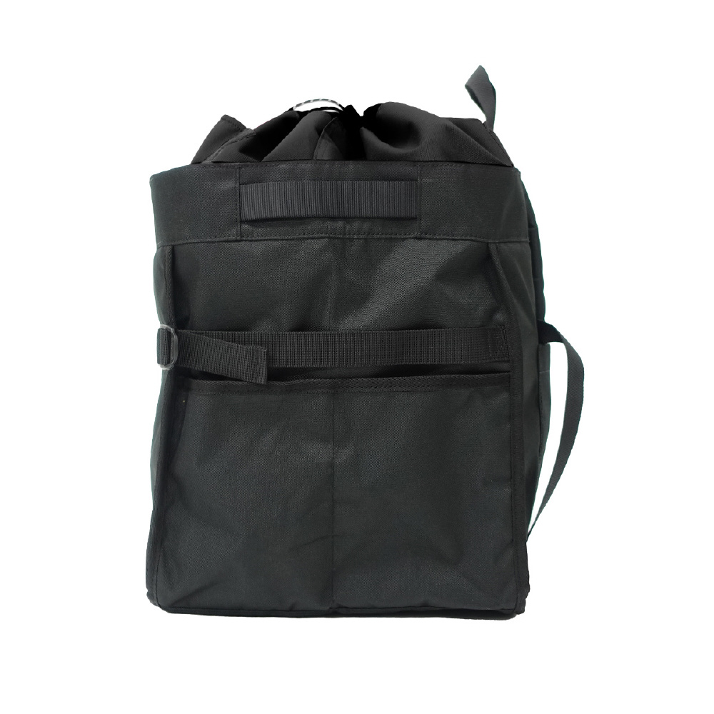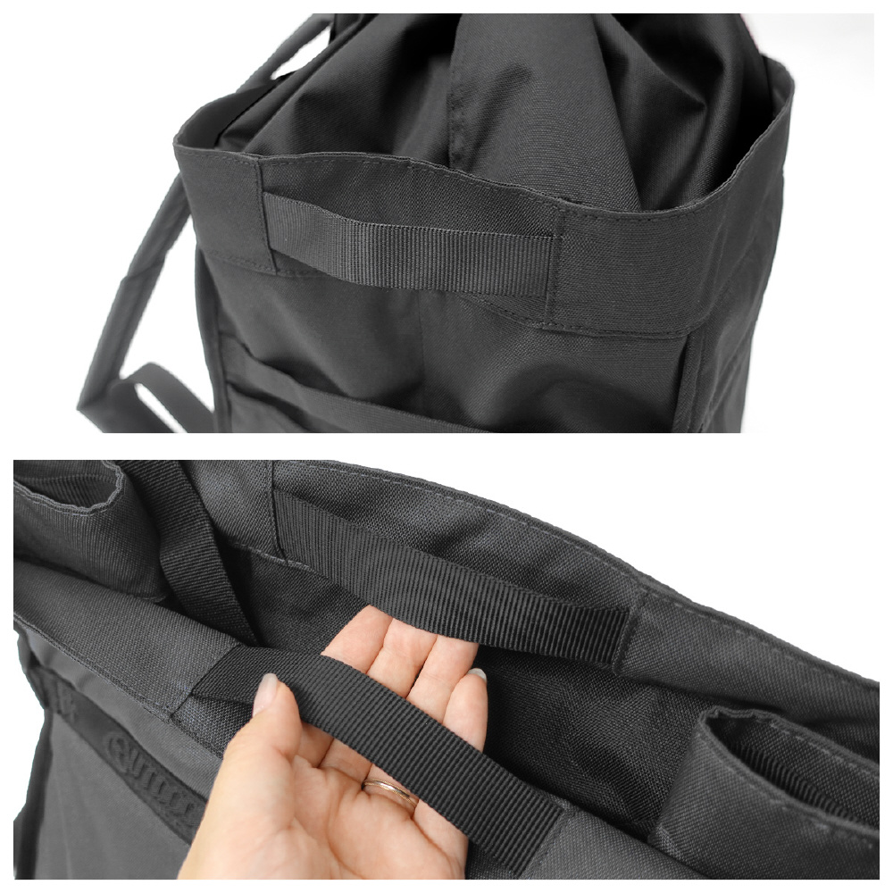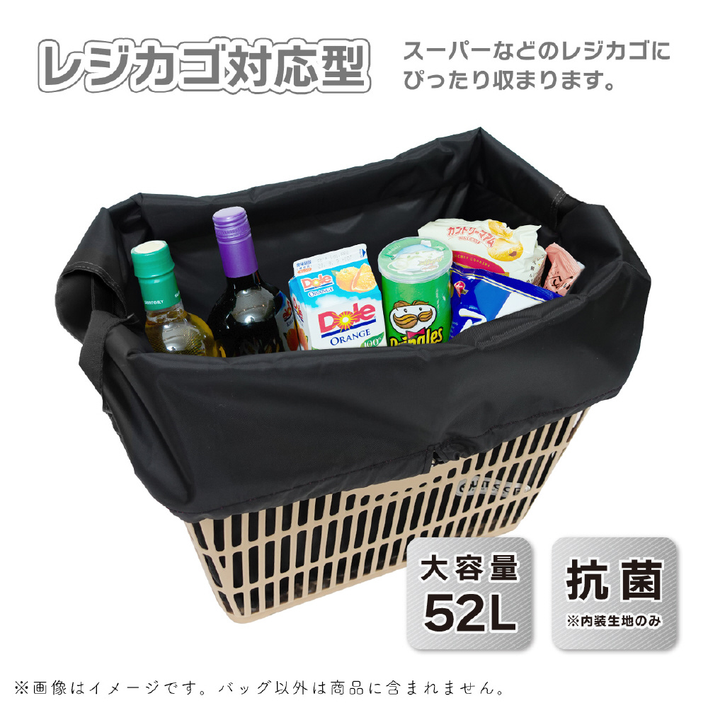 スーパーなどのレジカゴにぴったり収まるサイズ感で、お会計の際に荷物を詰め替える手間を省きます。パッド入り&パイピング仕様でしっかりと自立するので、荷物の出し入れもスムーズです。52Lの大容量ですが、折りたたんでサイドベルトで絞ることでマチを抑えることができるので、持ち運びの際も邪魔になりません。