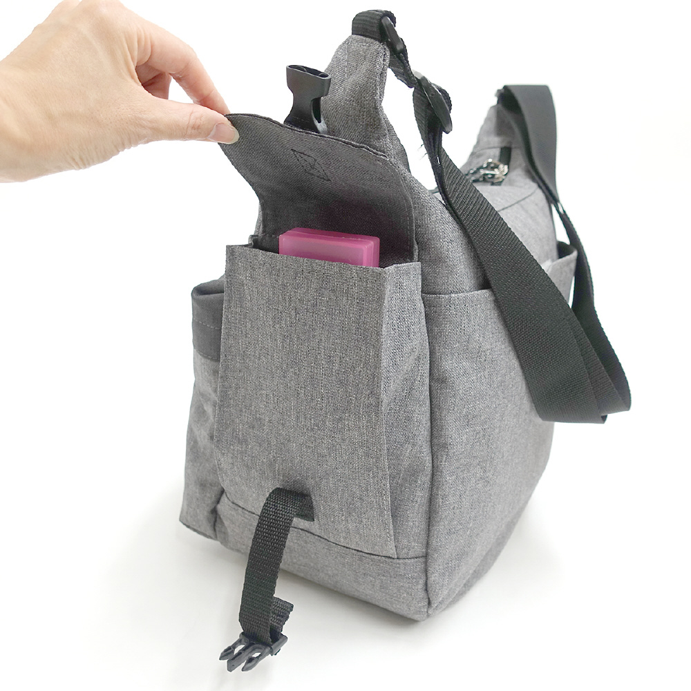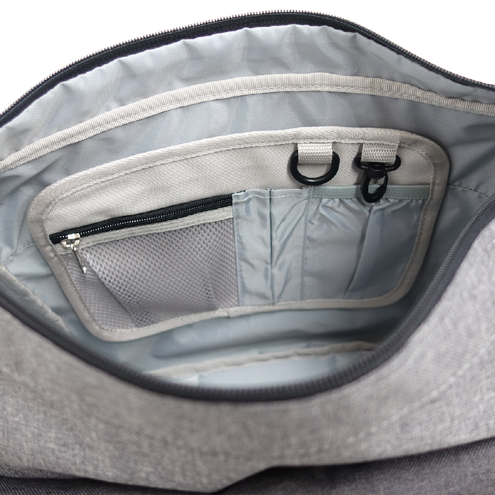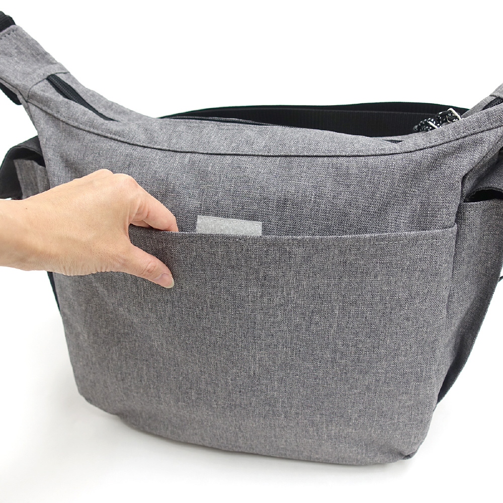 マザーバッグとしても活躍する豊富な収納面が魅力的なアイテムです。フロントにはジッパーポケット、サイドにはマチ付きのポケットを設けており、小物などを分けて収納することができます。またどちらもフラップが付いているため、万が一ジッパーを閉め忘れてしまった場合にも収納物が落下しづらく、安心です。メインルームには小物収納に便利なオーガナイザーを装備。無くしてしまいがちな鍵を取り付けたり、ばらけやすいペンなどをしっかりと収納することができます。使いやすさにこだわった、収納面もデザイン面も充実した万能アイテムです。