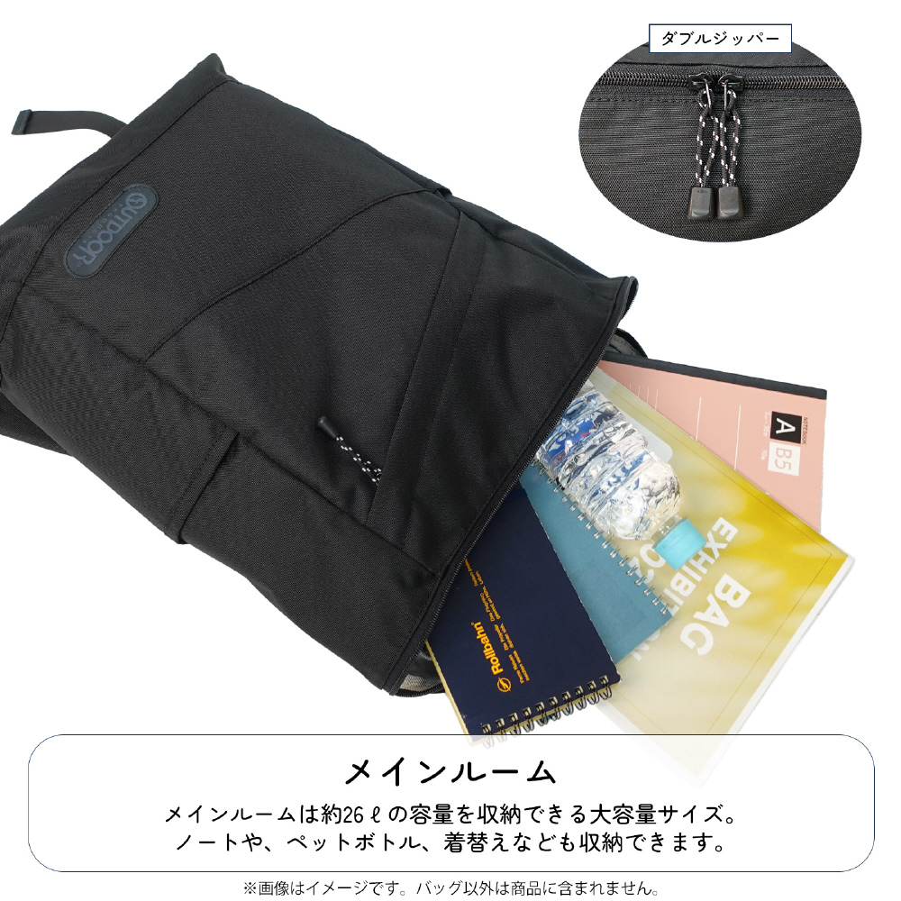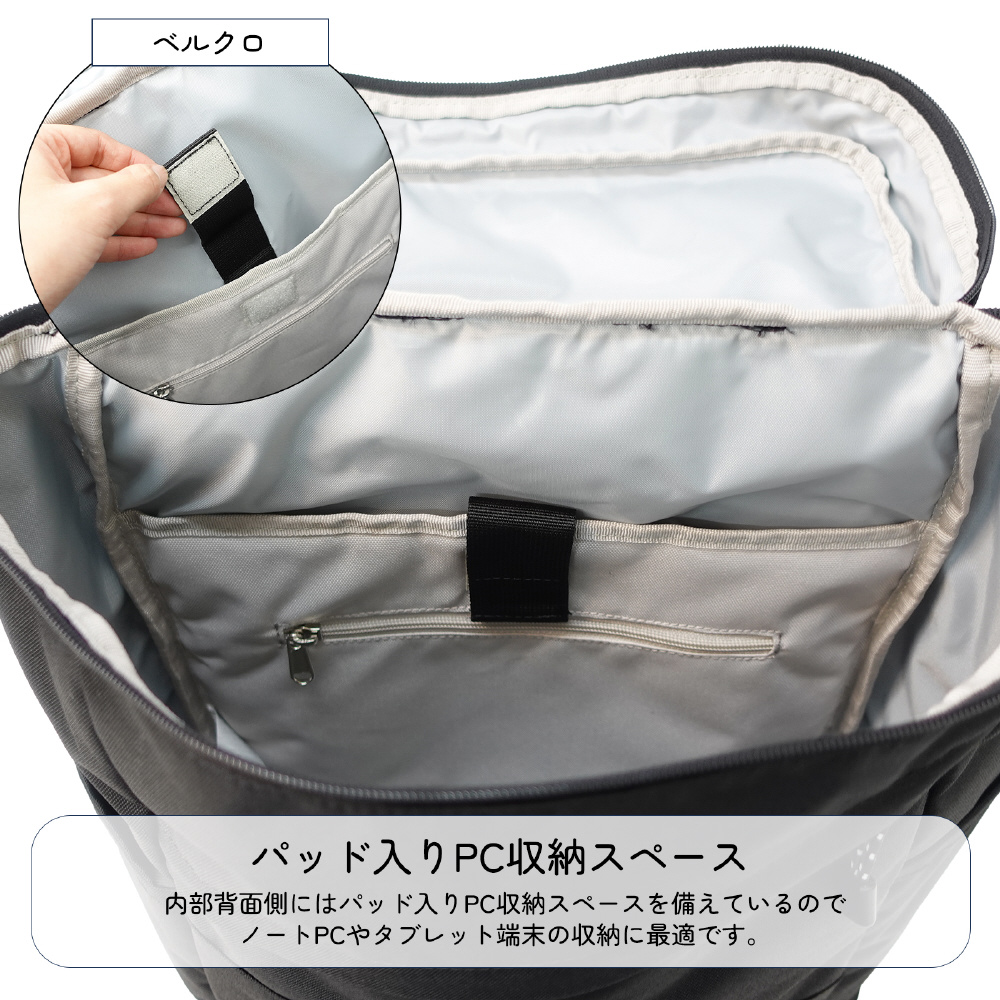 フロントにはジッパーポケット、サイドには折り畳み傘やペットボトルを収納できるオープンポケットが装備されており、メインルームにはPCやタブレット端末などの収納に適したパッド入りの収納スペースを設けています。またメインルーム開口部はコの字型で大きく開閉するため、物の出し入れもスムーズです。
