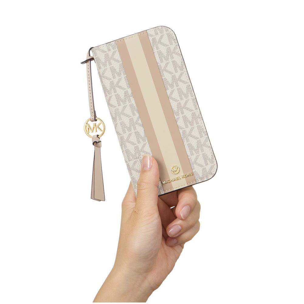 MKシグネチャーのロゴプリントキャンバスに、ストライプをあしらったデザインが特徴のブックタイプのスマホケースです。