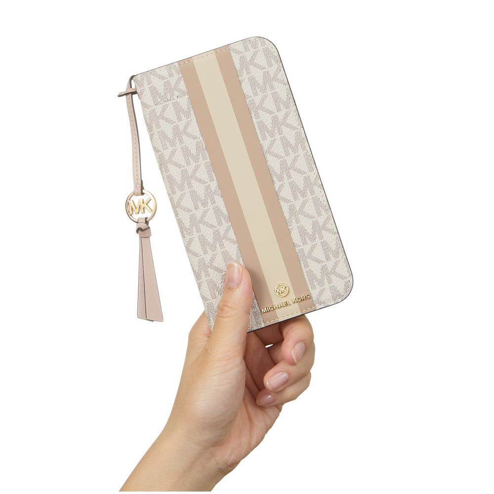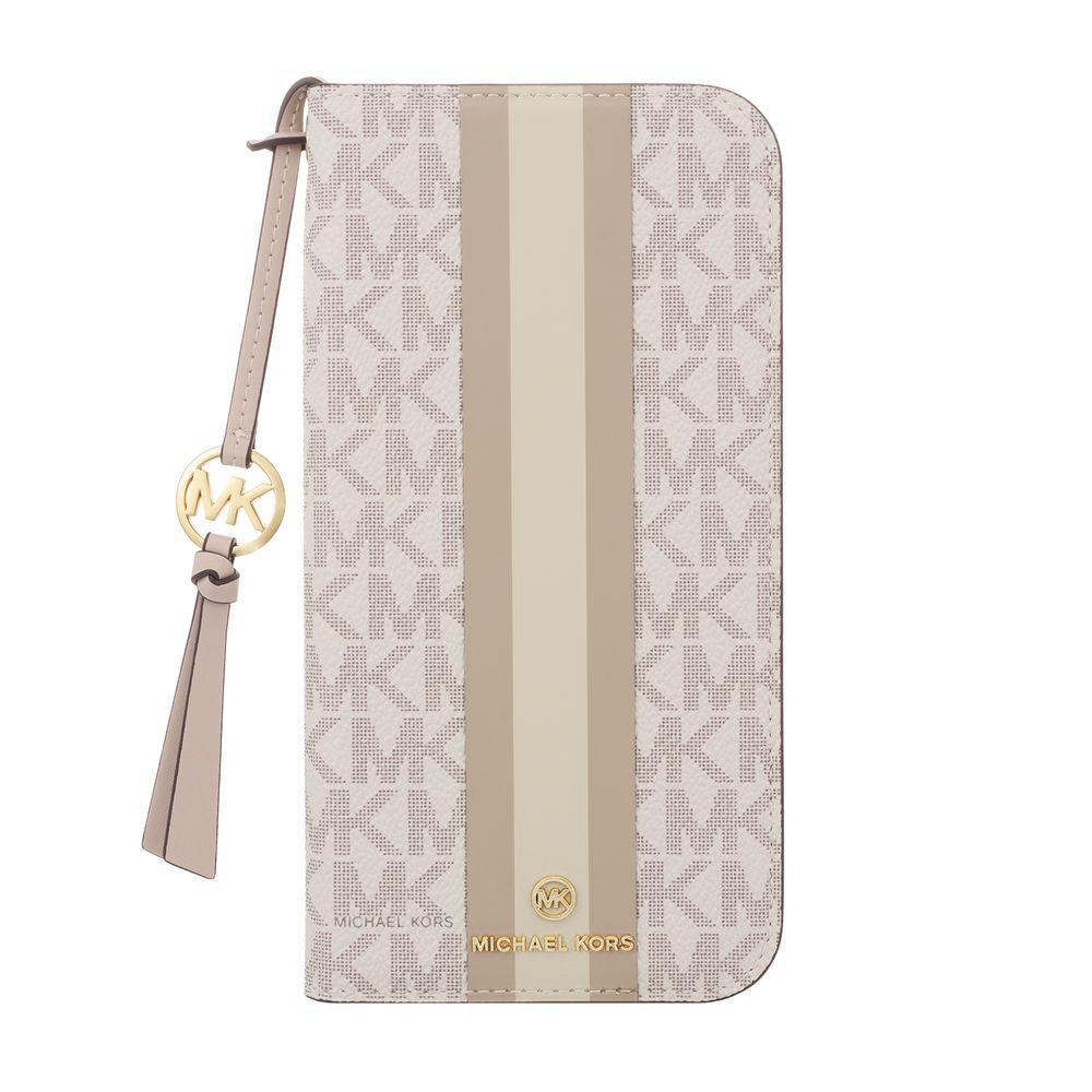 MKシグネチャーのロゴプリントキャンバスに、ストライプをあしらったデザインが特徴のブックタイプのスマホケースです。