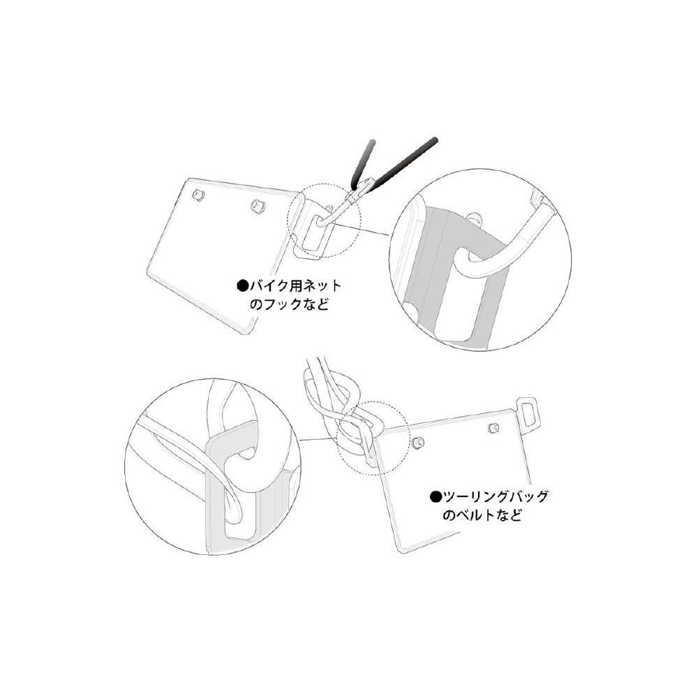 使用上の注意:●本商品を装着しますと商品の厚み分(約3mm)により、ナンバーボルトの長さが足りなくなる場合があります。ボルトは必ず十分な長さを確保し、締め付けできる部品を使用してください。●フック類を引っ張る方向や、バンドなどを締め付ける方法などによっては、商品または、車体側のナンバーベースが破損する恐れがあります。常識的な範囲内でご利用いただくことが前提の商品です。●軽量化を目的とした商品の肉抜き部分は、フックとしてご使用いただけません。●フェンダーレスキットの破損の恐れがありますので同時装着不可です。●灯火類にベルト等がかからないように注意してください。●使用中に商品の異常を感じた場合は、直ちに商品の使用を止めてください。●装着する方向によっては、商品の端面に返り(エッジ)が立ちます。これは製造方法によるもので、不具合ではありません。●車体によっては、ナンバーを固定するだけの強度しか確保されていませんので、商品のフックに必要以上の負荷はかけられません。●フックに引っ掛ける場合は両側に均等に負荷がかかるようにしてご利用ください。●負荷により車体側のナンバーベースが破損しても一切の責任を負いません。●スイングアームマウントのナンバープレートホルダーを採用する車両には使用しないでください。スイングアームマウントのナンバープレートホルダーはリアサスペンションのバネ下となり、そこに本品を取り付け、シートバッグ等の積載物の固定に利用すると、積載物の固定が不十分となり脱落の恐れがあります。これに起因する積載物及び車両の補償や事故等の責任については弊社は一切の責任を負いません。