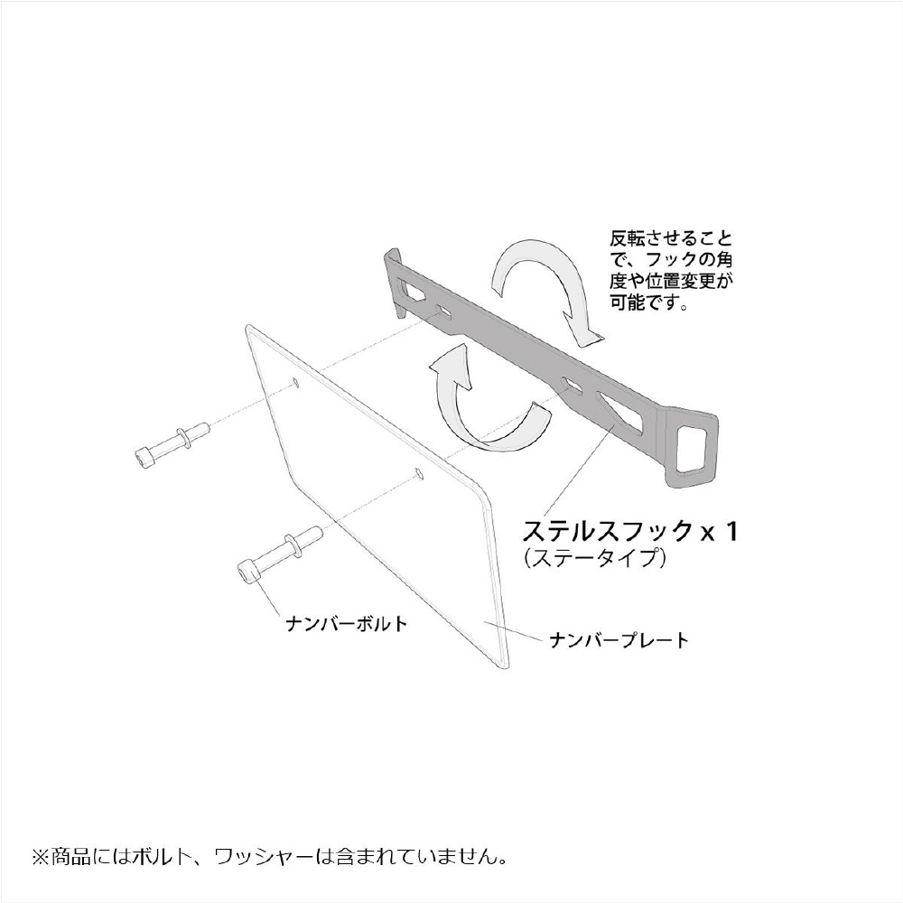 特記事項:●バイクネットやツーリングバッグなどの固定に便利なフックが増設できます。●大型のフックやバンドを通して固定できる荷掛けフック形状になっています。●ナンバープレートを取り外してから、車体側のベースの中間に挟むだけの簡単装着です。●フック部分のスペースさえ確保できれば50ccクラスからリッターバイクでも車種を問わずご利用頂けます。商品は上下、表裏をお好みの向きに変えてお使い頂くことが可能です。●本体は強度を保ちながら肉抜きを施し、軽量かつ薄型の設計です。カラーリングはマットブラックの為、取り付け後の違和感もなくスタイリッシュに引き締めます。※商品にはボルト、ワッシャーは含まれていません。