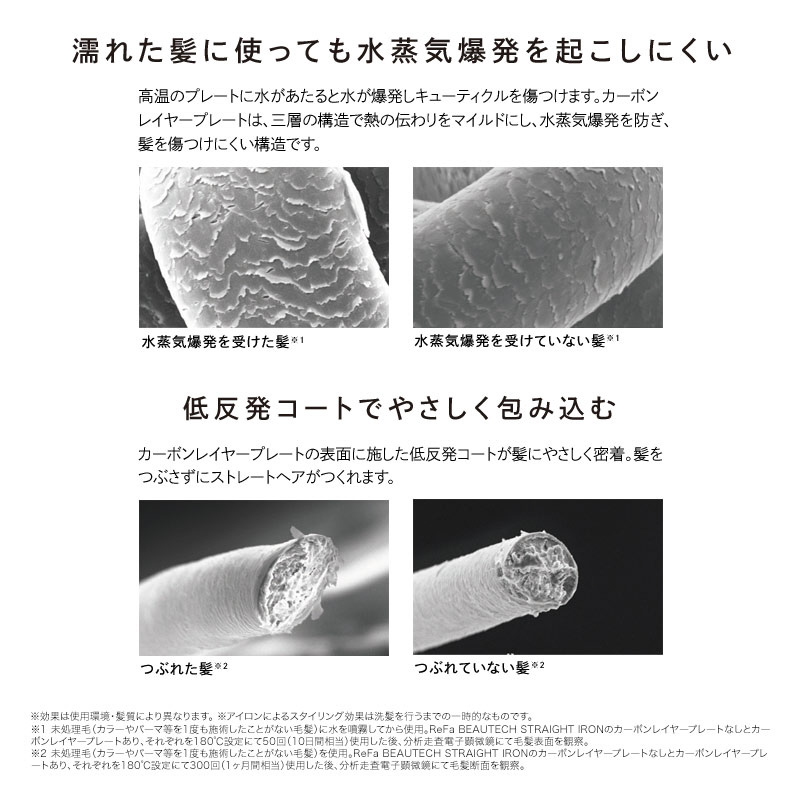 独自の技術「カーボンレイヤープレート」が、ストレートアイロンによる水・熱・圧のダメージを抑えながら、