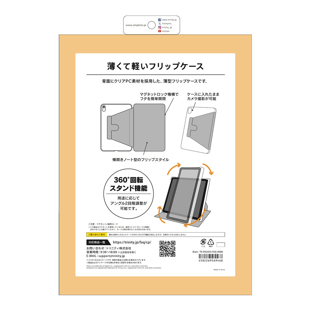 11インチ iPad(A16)、10.9インチ iPad(第10世代)用 FLIP SHELL 360 360度回転式 背面クリア フリップシェルケース ブラック TR-IPD2410-FS36-SMBK
