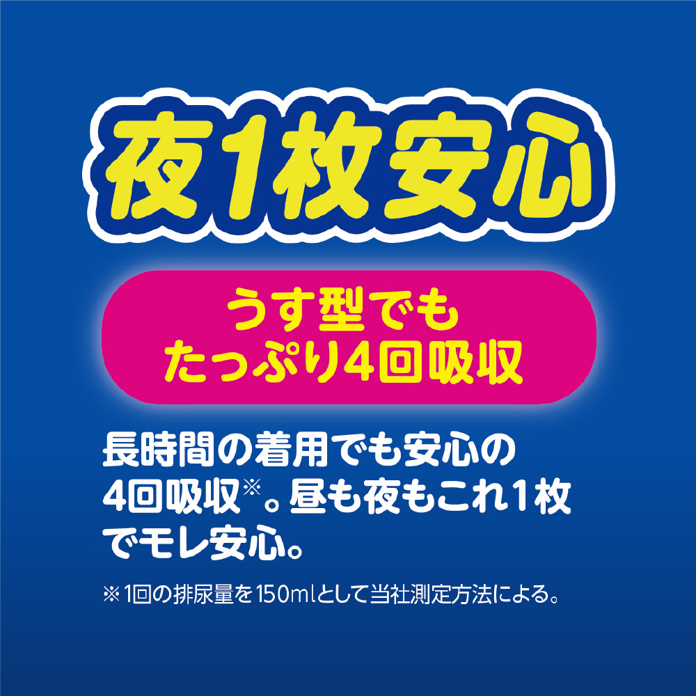 長時間の着用でも安心の4回吸収※。昼も夜もこれ1枚でモレ安心。