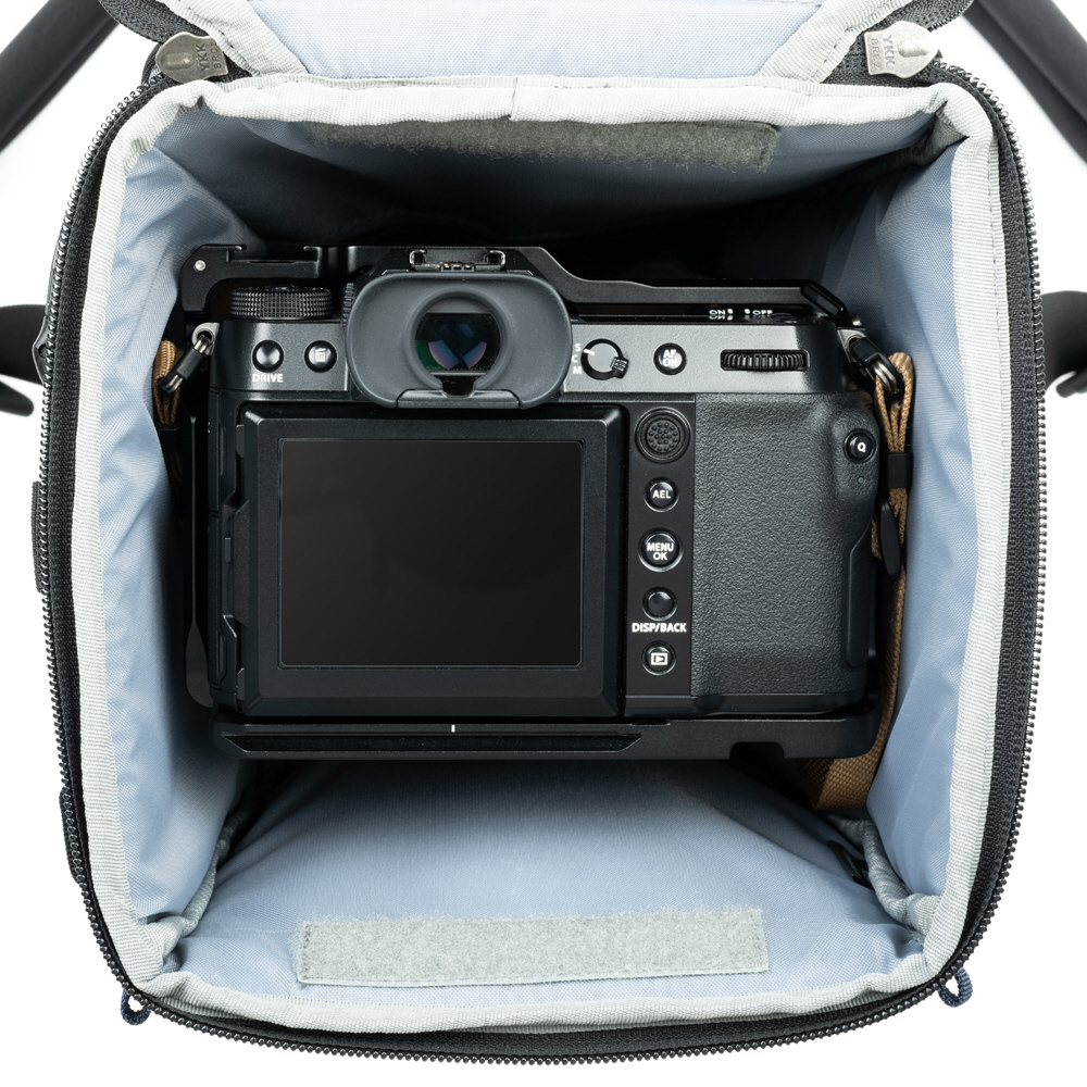 バッグ内部にはディバイダーと、カメラストラップを取り付けたまま収納した際にカメラ液晶画面への傷を防ぐためのやわらかい仕切りが付属。不要な場合は取り外しができます。