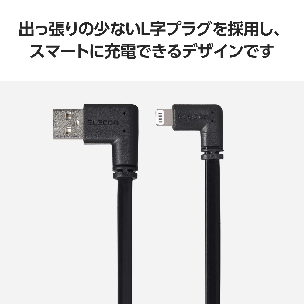 出っ張りの少ないL字プラグを両端に採用し、充電の際に邪魔になりにくい設計です。